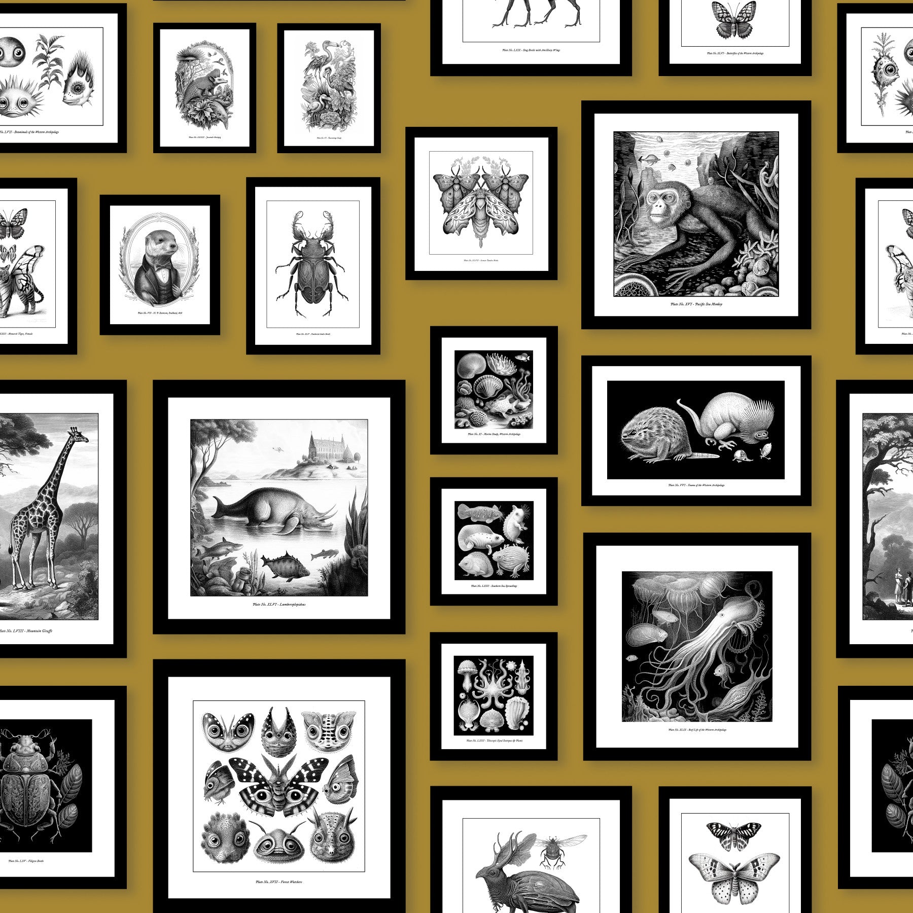 Introducing "Fantastic Creatures" a delightfully surreal wallpaper that puts a cool modern twist on traditional library aesthetics. Designed with an eye for the absurd, it depicts an intriguing world filled with charmingly fantastic creatures, which seem to leap right off your walls, inviting daydreaming and sparking imaginative conversation. A mischievous otter, central to the print, adds a whimsical explorer's touch that sets the mood. Brimming with beautifully strange insects and mysterious creatures heralding from the mythic world of the Western Archipelago, the salon style collection of framed scientific illustrations will lend a surprisingly stately feel to any room. Giving thought to the smallest details, this tastefully dark print seamlessly combines whimsy with sophistication to create a striking balance. As a lively alternative to ordinary wall coverings, the Fantastic Creatures wallpaper in Anthracite perfectly adds a dash of the unexpected to your interior design.