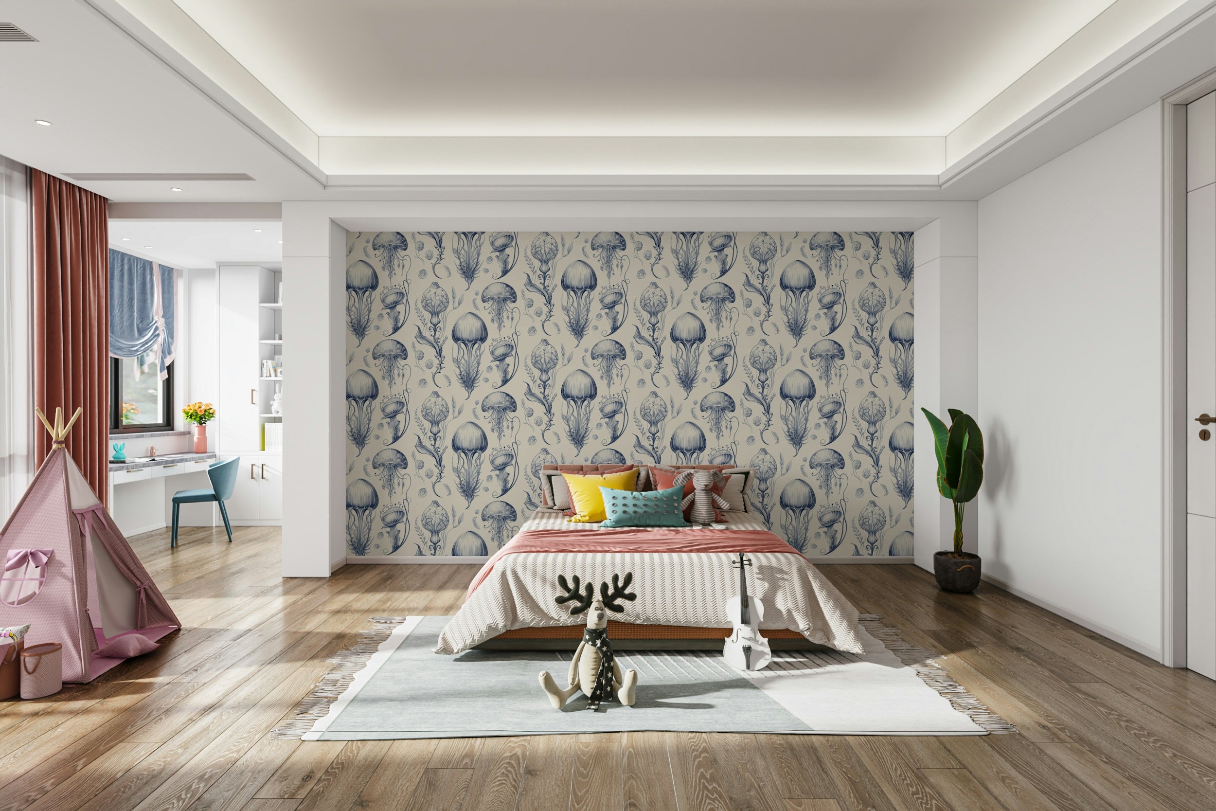 Fantastic Jellyfish - Delft Blue & Cream wallpaper for bedrooms