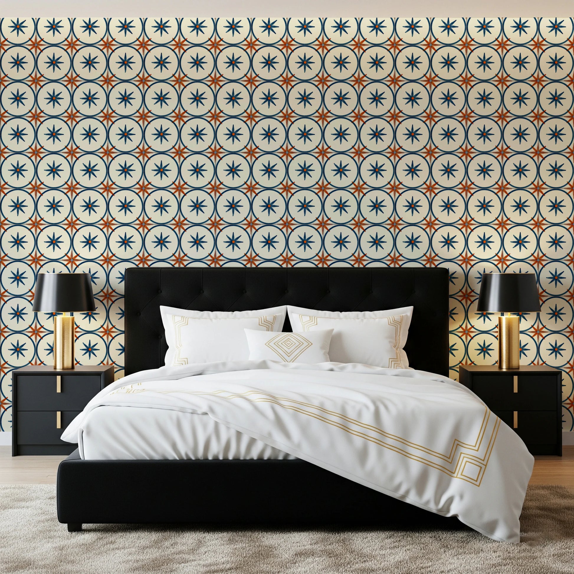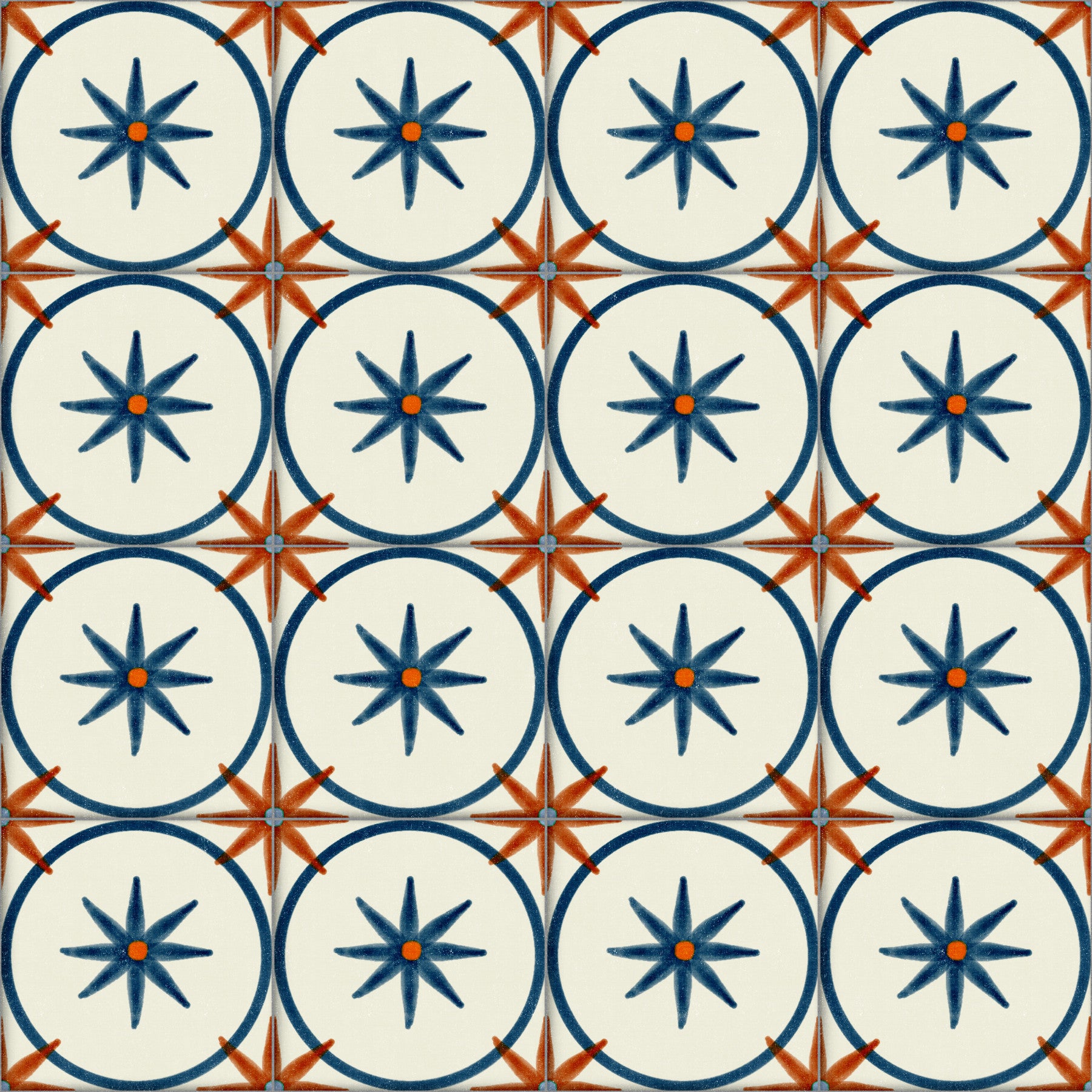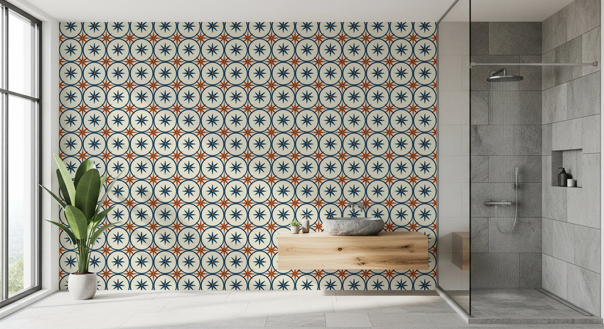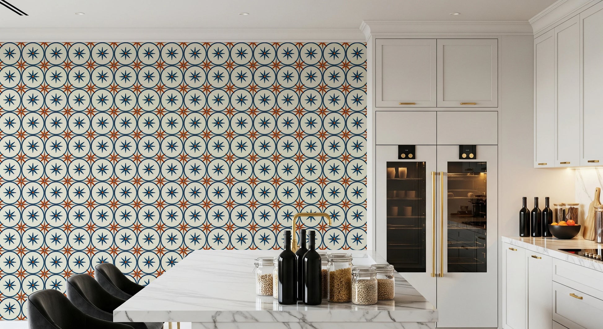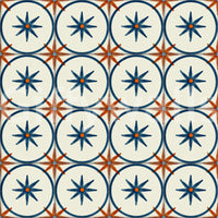 Evoke a sense of serene simplicity with the 'Farmhouse Timeless Backsplash Blue' wall décor. This design reimagines classic tilework with a touch of rustic charm, perfect for lending an inviting and sophisticated atmosphere to any space. The repeating pattern features a striking blue star motif set within circular frames, interspersed with warm terracotta accents that bring a vibrant contrast to the soft, cream-coloured background. Each element blends seamlessly, creating a timeless aesthetic that complements both modern and traditional interiors. This wall decor adds a touch of refined elegance to kitchens, bathrooms, or any space yearning for a splash of colour and timeless design. Infuse your home with the warmth and inviting comfort of a classic farmhouse, elevating its character with this beautiful and enduring pattern. It is ideal for creating a welcoming and stylish environment, adding a unique and personal touch to your décor.