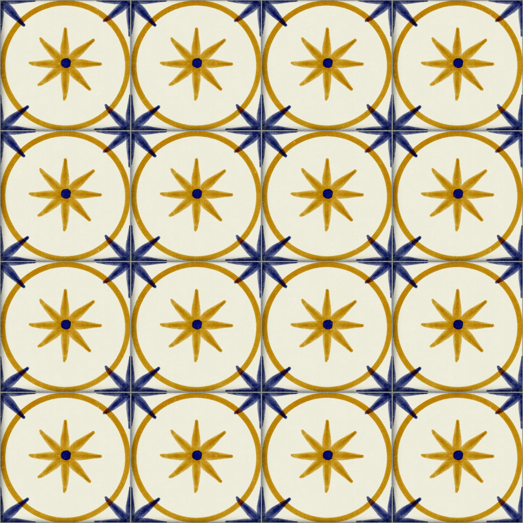 Embrace the heart of farmhouse chic with this 'Farmhouse Timeless Backsplash Gold' wall décor. The pattern features a repeating motif of golden starbursts encircled by warm gold rings, set against a creamy, aged white background. Intersecting the circles are bold, navy blue accents, adding a touch of rustic elegance and visual interest. This design evokes the feeling of reclaimed vintage tiles, creating a timeless aesthetic perfect for a cosy kitchen, bathroom, or any space where you desire a touch of historical charm. The simple yet striking colour palette provides a soothing, inviting atmosphere, transforming any plain wall into a stylish focal point. Bring the enduring appeal of a classic farmhouse to your home with this beautifully detailed and captivating design.