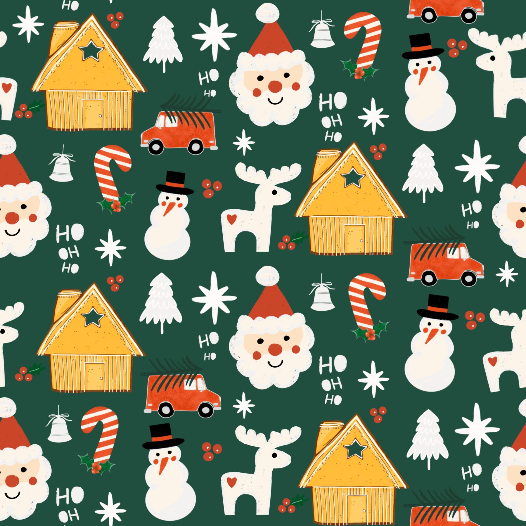 Get ready for Christmas with this playful repeating pattern! Friendly snowmen, smiling Santa faces, and happy reindeer mix with gingerbread houses. This cheery holiday illustration comes alive on a deep green ground. This wallpaper for walls is perfect in a kid's bedroom, hallway, or even a fun home office. The bright colours and simple design add a touch of joy. The design complements classic holiday decor.