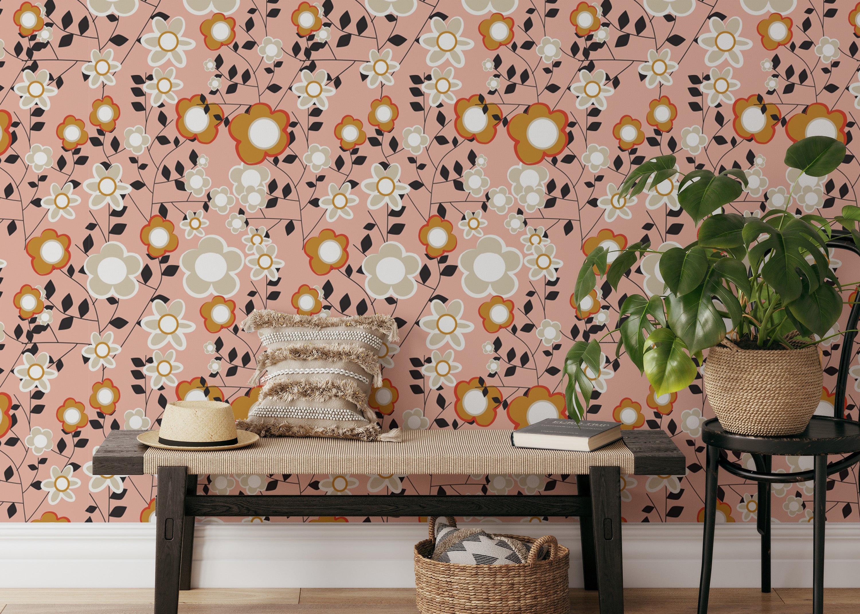 Light pink flower mural with bold patterns