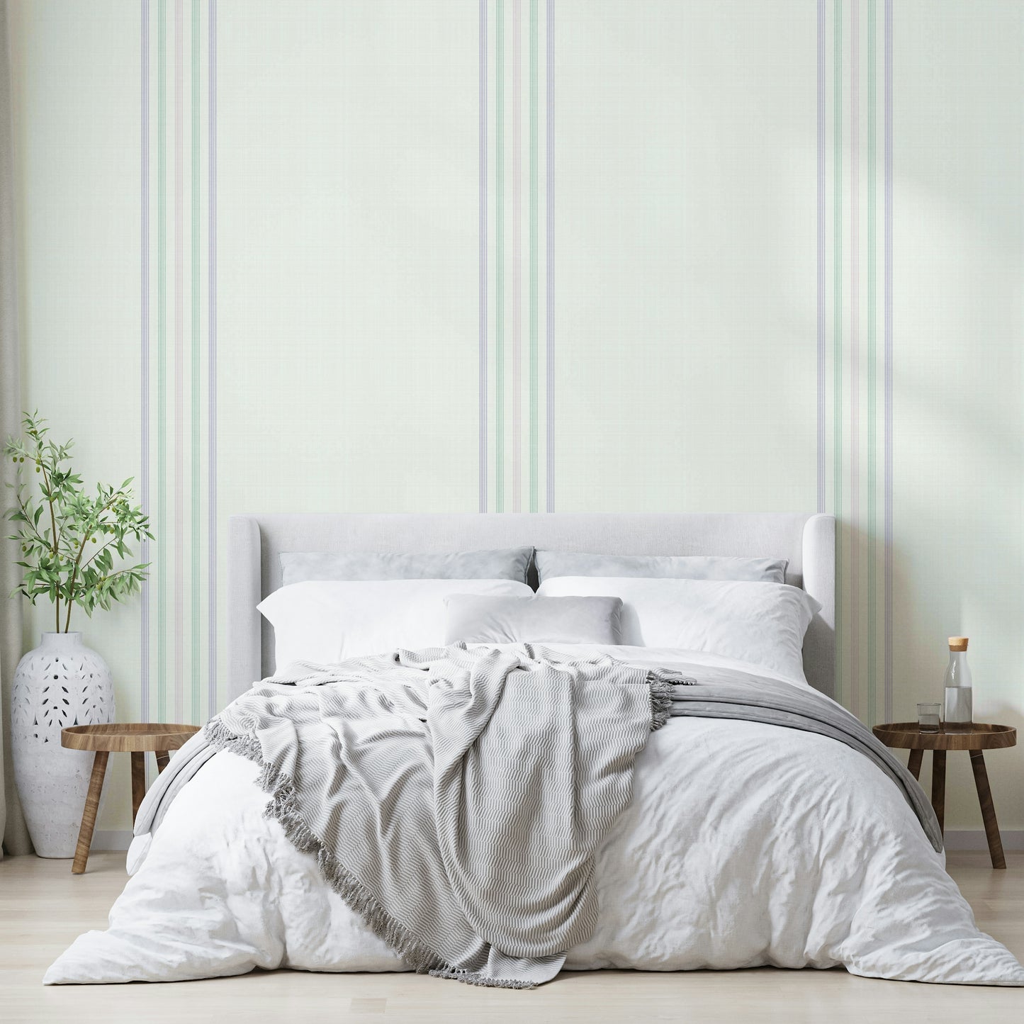 Delicate and calming, Fine Stripes Pastels offers a serene visual experience through its subtle interplay of color and form. This wallpaper showcases meticulously drawn, fine stripes in soothing pastel shades of lavender, soft green, and blush pink, set against a textured, off-white background. The design evokes a sense of quiet sophistication and gentle harmony, perfect for creating a tranquil and inviting atmosphere in any space. Its minimalist aesthetic makes it versatile for various design styles, from modern to traditional.