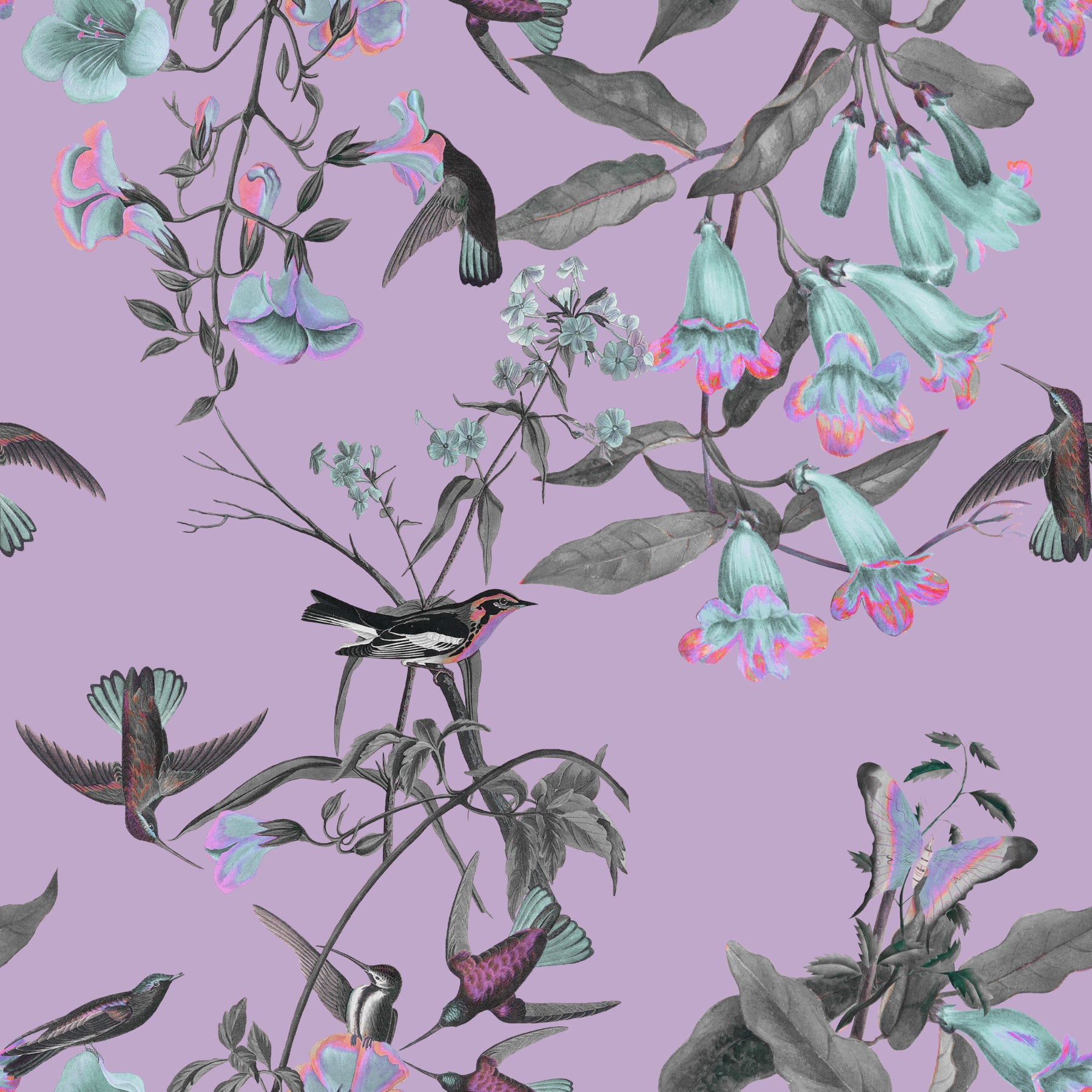 Transform your home with this delightful floral and bird design. The wallpaper features delicate renderings of trumpet flowers and hummingbirds against a soft violet backdrop. It evokes a sense of serenity and natural beauty. This wallpaper for walls lends a touch of elegance to any space, whether it is a bedroom, living room, or hallway. The unique colors complement both modern and classic interior design styles, adding charm and character.