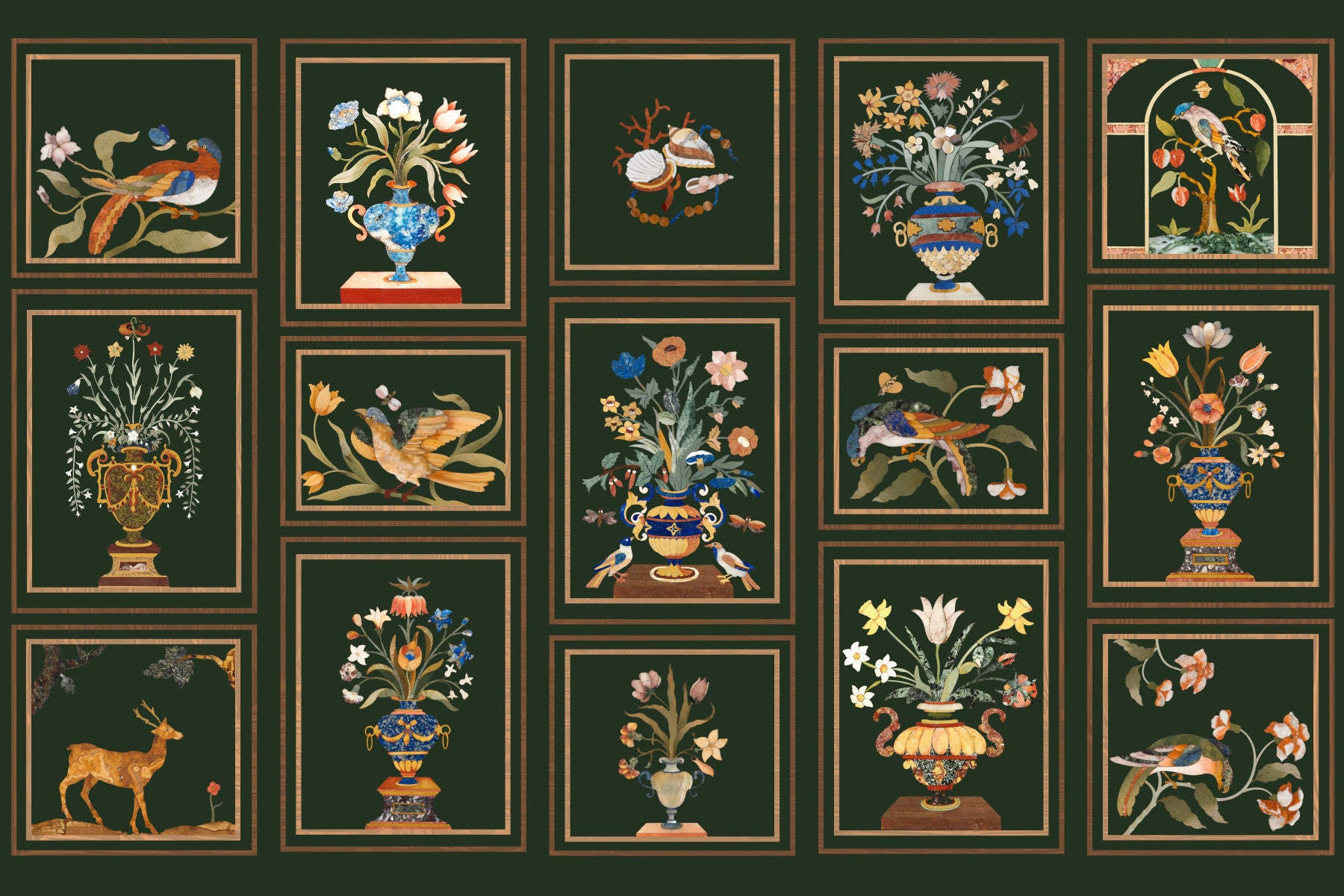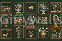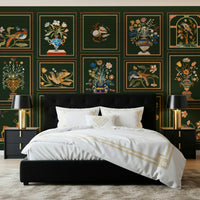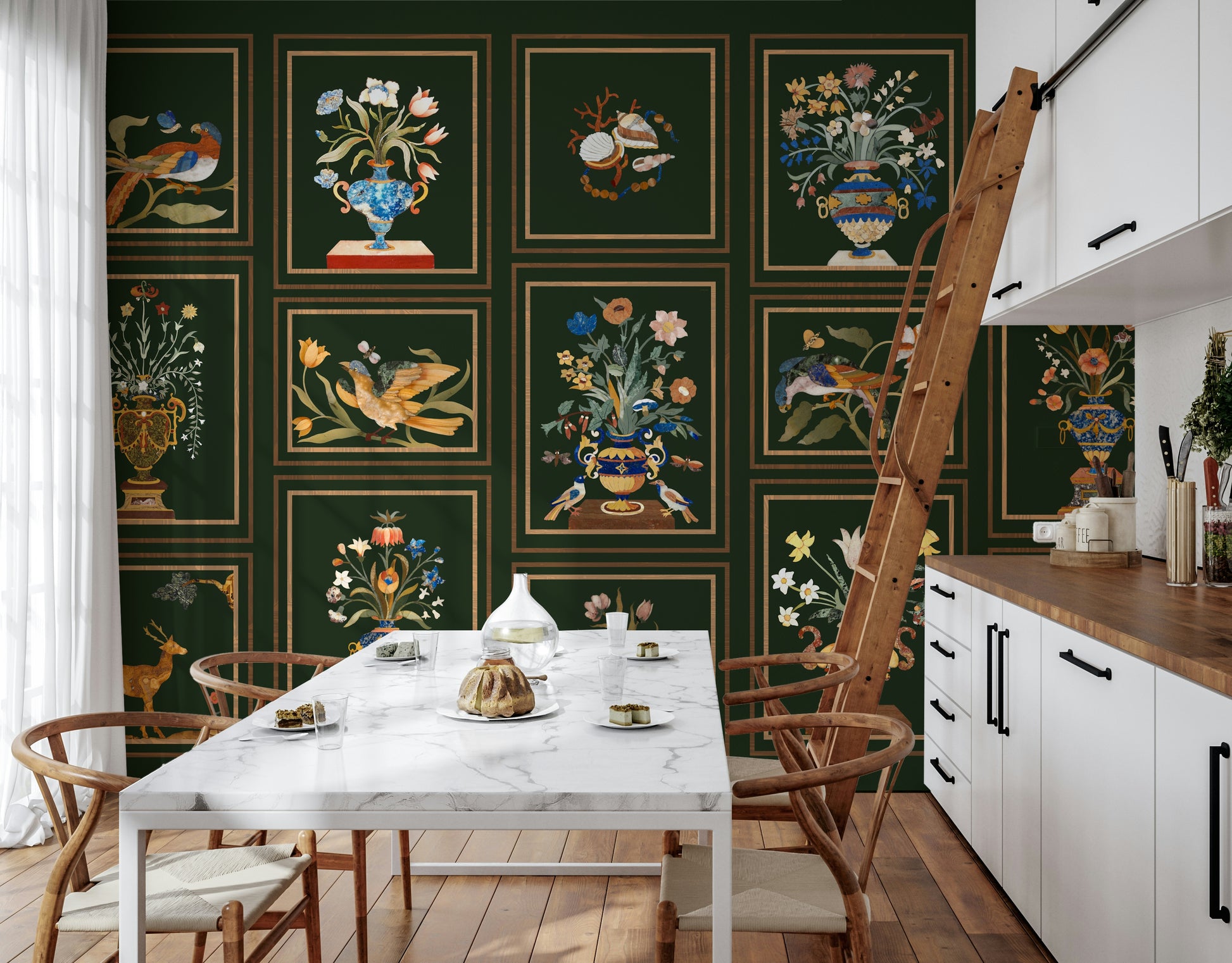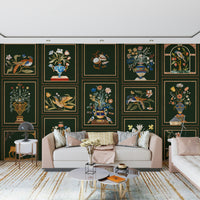 Elevate your interior with this elegant wallpaper for walls, reminiscent of a grand estate. Framed panels featuring birds and floral arrangements create a sophisticated, vintage feel. The detailed designs showcase a rich colour palette of earthy browns, deep greens, blues, and muted oranges. Ideal for a dining room, living room, or hallway, the repeating pattern offers a luxurious touch, complementing classic and contemporary décor. This wallcovering brings artistic charm and timeless appeal to any space, transforming it into a gallery-like experience.