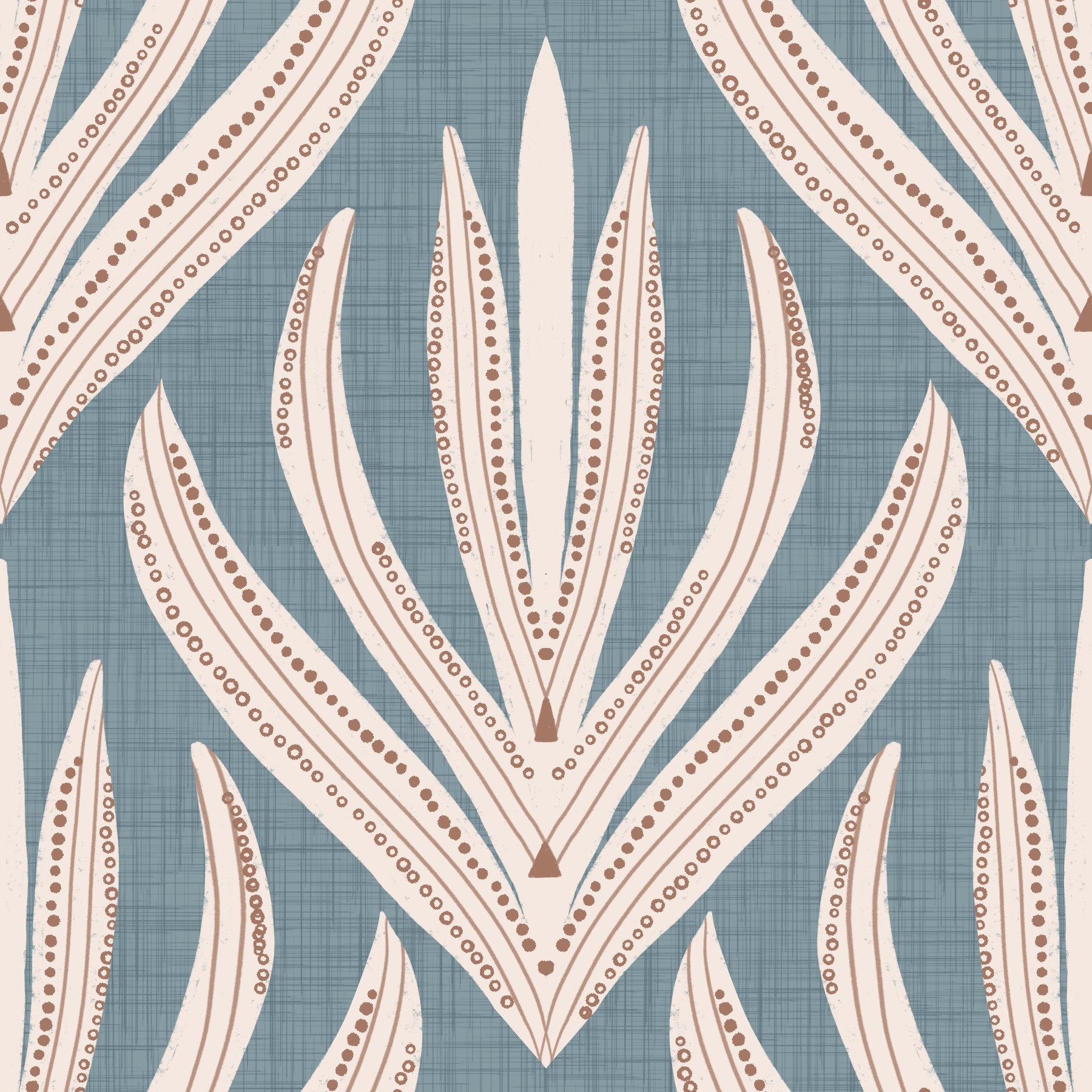 Decorative wallpaper mural with cream geometric floral elements over a muted blue backdrop.