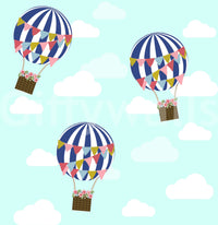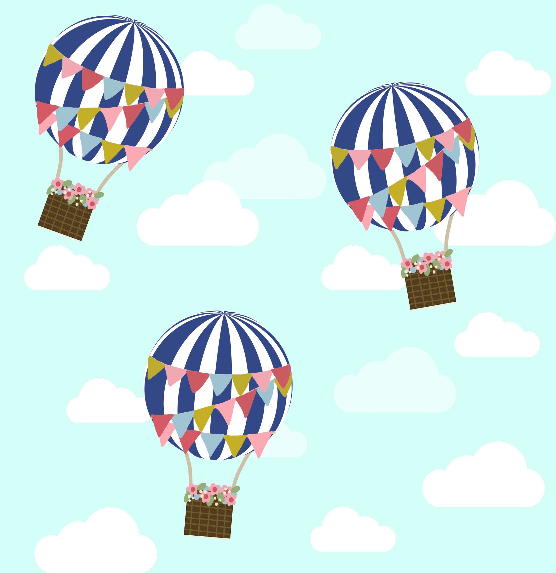 Drift away into a whimsical dreamscape with this enchanting "Floral Hot Air Balloons" wallpaper. Three charming hot air balloons, adorned with navy and white stripes and cheerful bunting in soft pastel hues, float gracefully amidst fluffy white clouds on a tranquil light blue sky. Each basket is lovingly decorated with a delicate arrangement of pink and white flowers, adding a touch of romantic elegance. This design evokes a sense of carefree adventure and joyful serenity, perfect for creating a peaceful and imaginative atmosphere in any room.