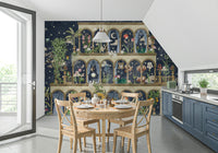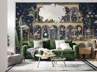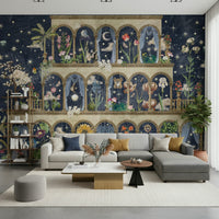 Bring a touch of magic into your home with this stunning wallpaper for walls. The design features a captivating balcony scene, filled with lush flowers, curious animals, and dreamy celestial elements against a star-speckled, deep blue backdrop. The arched architectural details frame vibrant blooms and glimpses of a starry night sky, creating an elegant and whimsical aesthetic. This wallpaper enhances the ambience of any bedroom, living room, or hallway, adding depth and character to your interior spaces. The harmonious blend of colours and intricate details creates a sophisticated and calming effect.