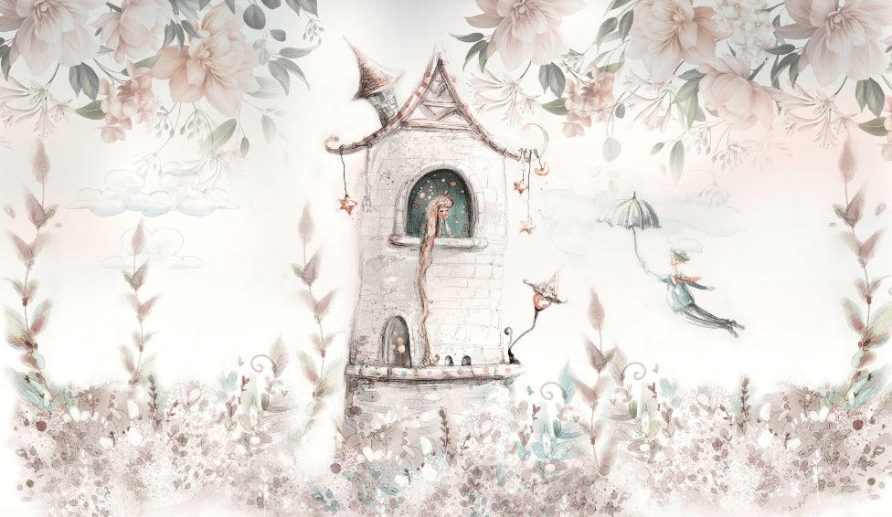 Enchanting princess tower floral wallpaper mural for kids' rooms.