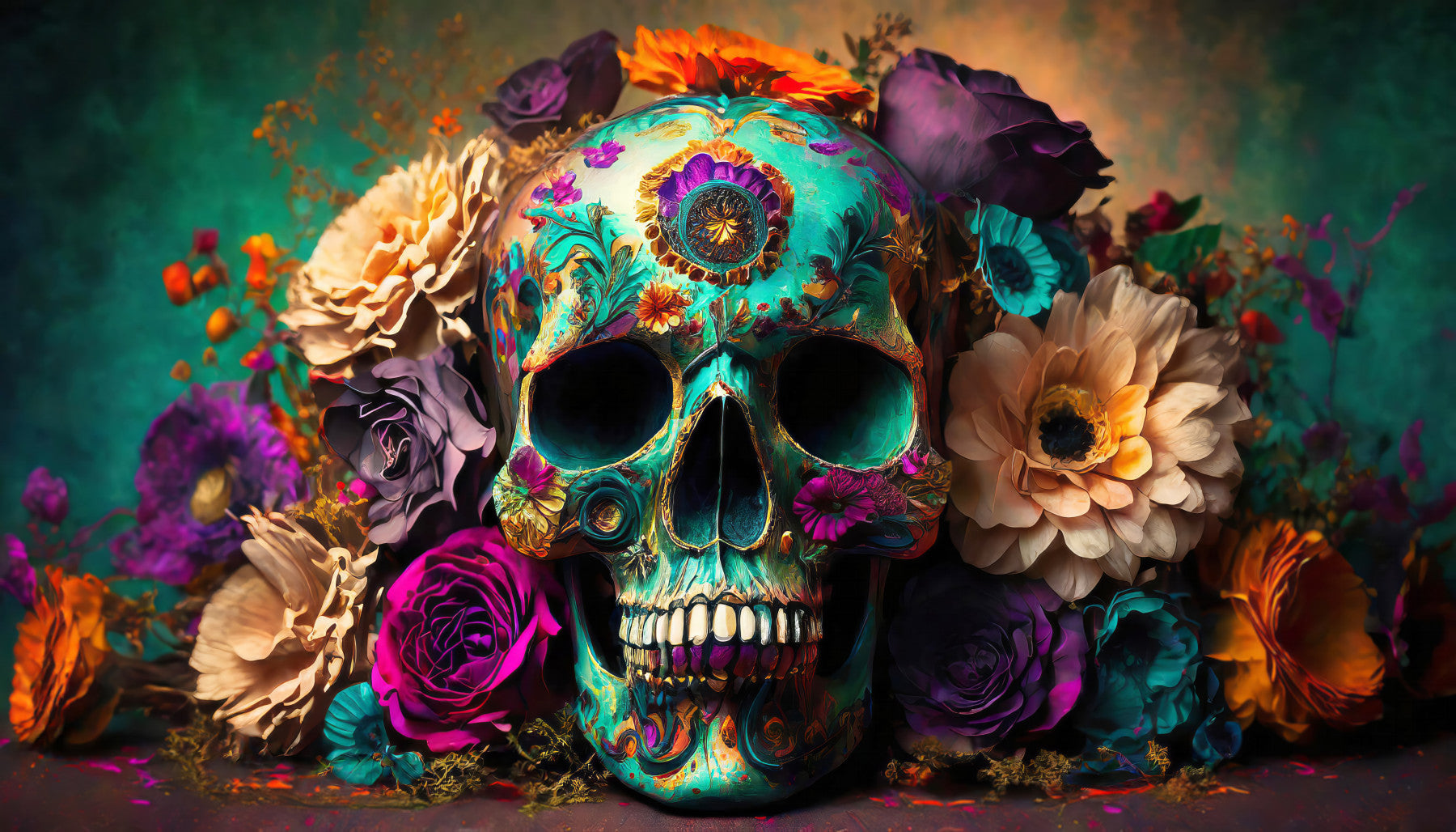 Celebrate the beauty of life and remembrance with 'Floral Skull,' a stunning wallpaper that captures the essence of Día de los Muertos. A vibrantly decorated skull serves as the centerpiece, adorned with intricate floral patterns in hues of teal, purple, and orange. Surrounded by a bouquet of roses and other blooms, this image evokes a sense of joy and celebration. Perfect for those who appreciate art with a cultural touch, this wallpaper is sure to bring vibrant energy to any space.