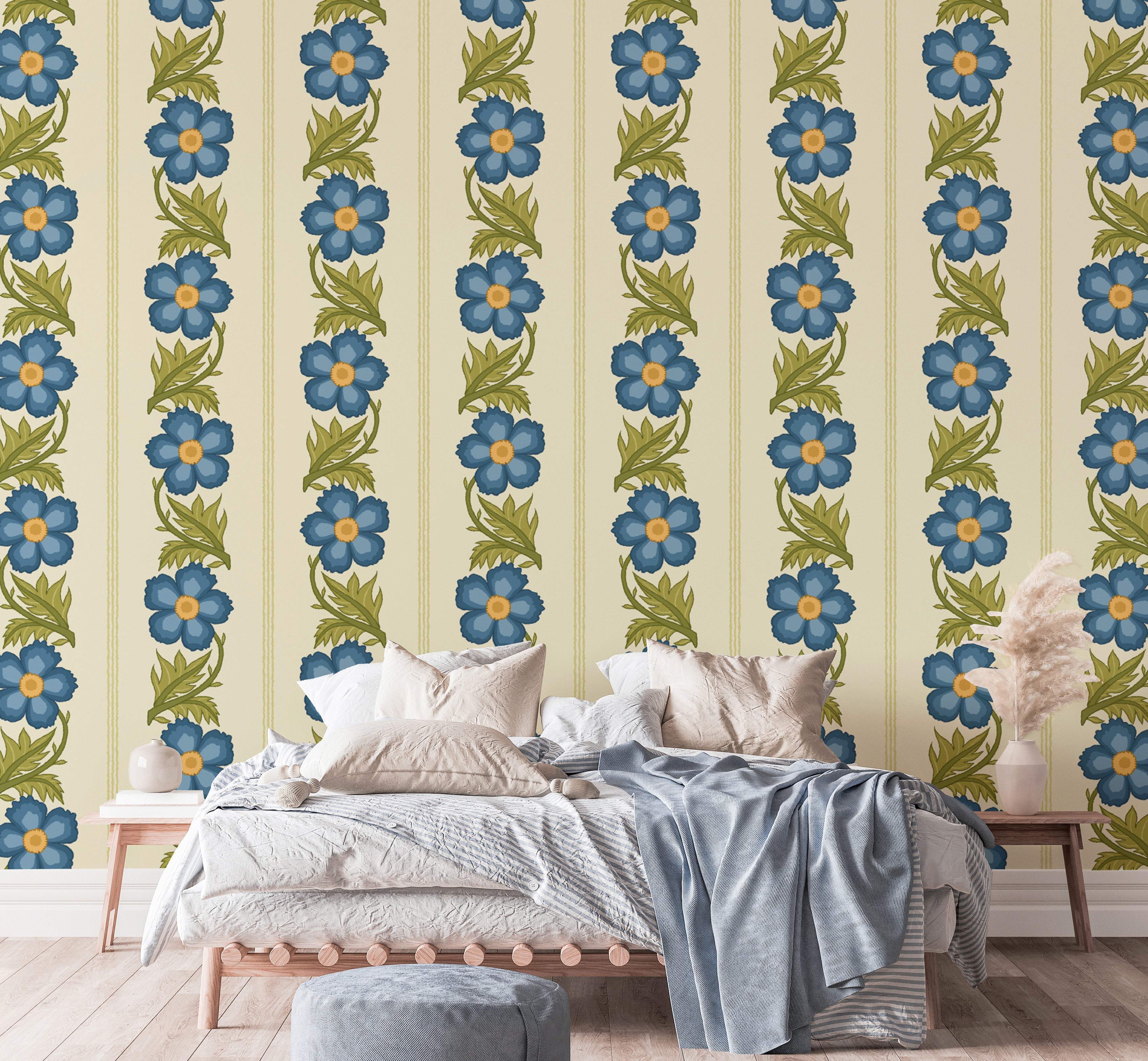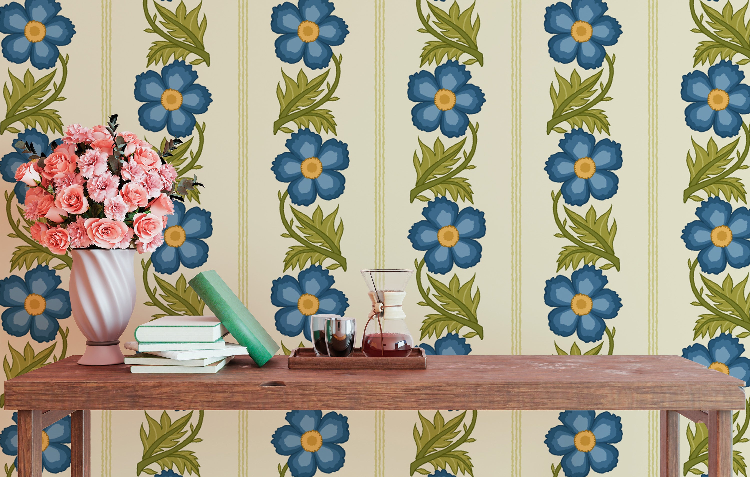 Artistic blue floral stripe wallpaper for unique, vibrant spaces.