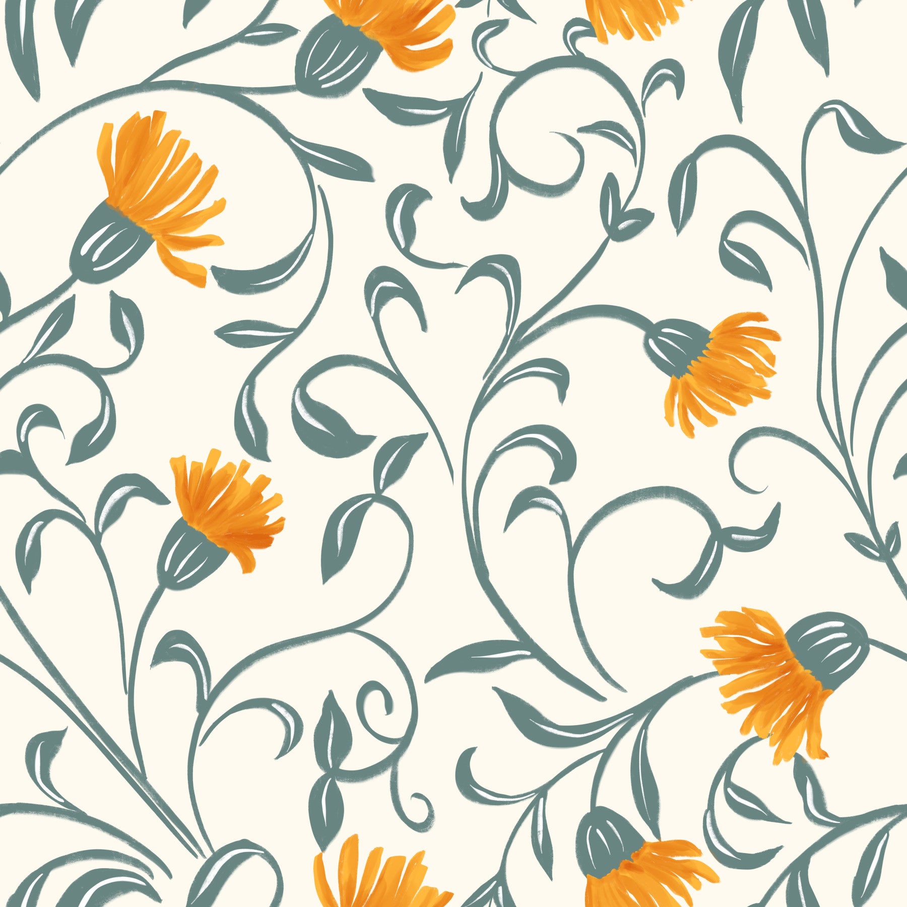 Add warmth and movement to your room with Flow and Bloom - Off White wallpaper. This floral design features golden-orange blooms dancing along flowing green vines, set against a soft off-white background. The hand-painted style offers a cheerful and artistic touch, making it ideal for living rooms, bedrooms, or creative spaces. Each flower appears mid-motion, giving your walls a sense of rhythm and flow. This wallpaper for walls works well with boho, cottage, and eclectic interiors. Use it as a statement wall or full-room covering to introduce a fresh and lively vibe with natural charm and playful energy.