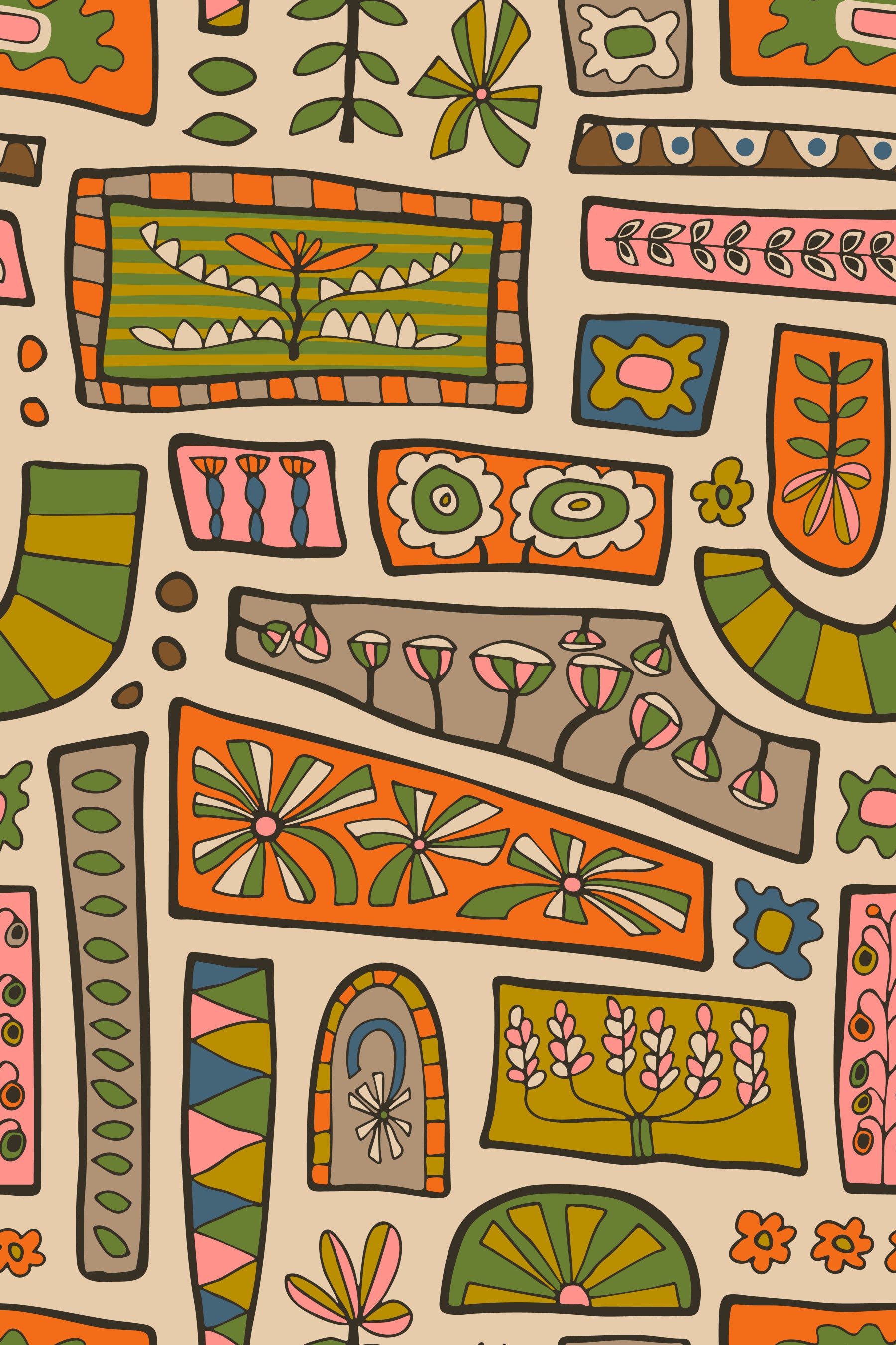 Colourful bohemian patches filled with hand-drawn flowers and plants, both sophisticated and fun! In Warm Earthy Colours: Beige, Green, Blue, Mustard Yellow, Orange, Pink and Brown on Cream. This pattern design is also available in Other Colourways too. Original wallpaper pattern design by Jackie Tahara of UnBlink Studio.