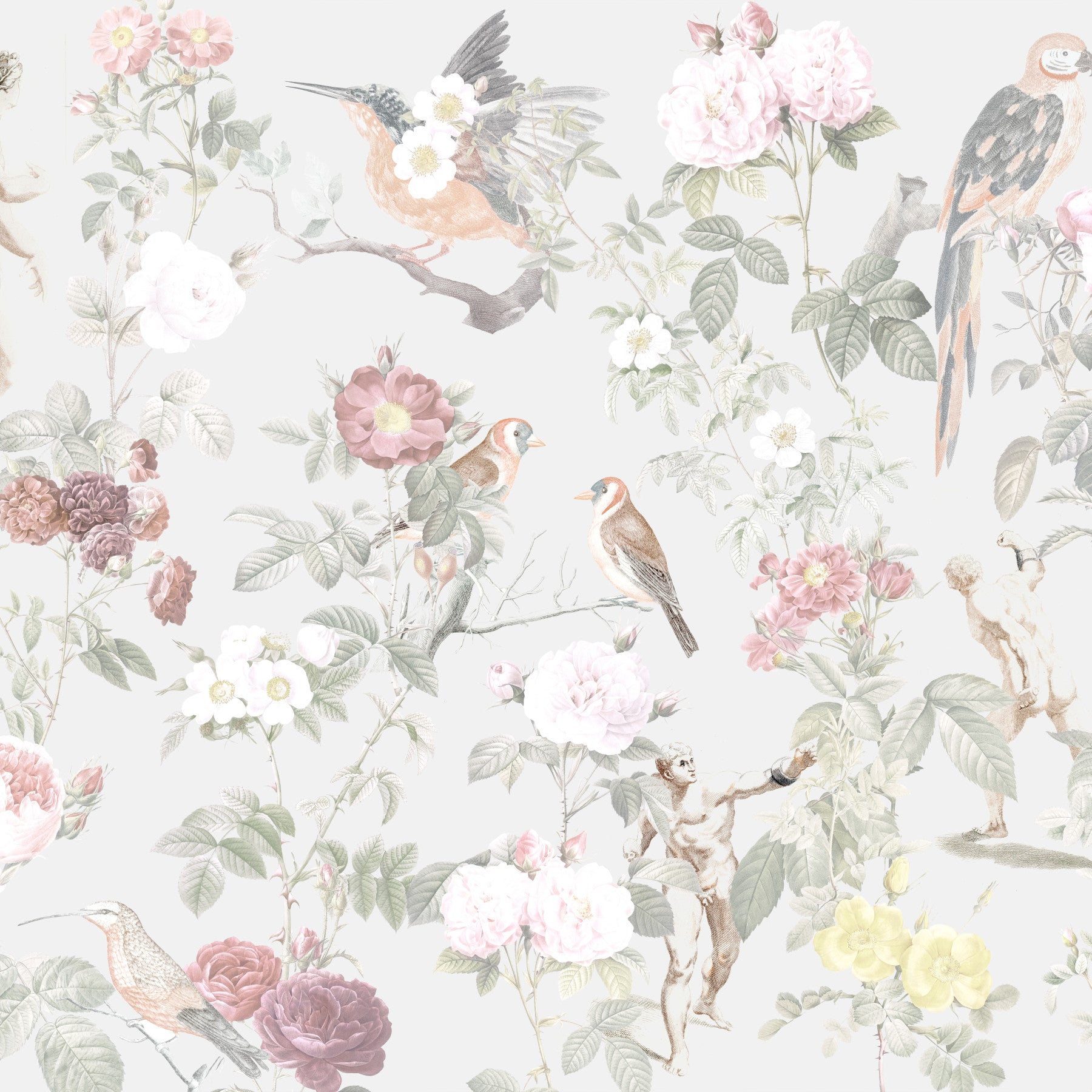 Indulge in the exquisite Flowery wallpaper, a breathtaking tapestry of delicate roses in blush pinks, soft whites, and subtle yellows. Intricate botanical illustrations are interwoven with graceful birds, their plumage echoing the floral palette. Classical statuesque figures subtly enhance the design, adding an element of timeless elegance. This wallpaper evokes a serene and romantic mood, transforming any space into a haven of sophisticated beauty. The soft color scheme and detailed artistry create a tranquil yet captivating atmosphere, perfect for adding a touch of refined charm to your home.