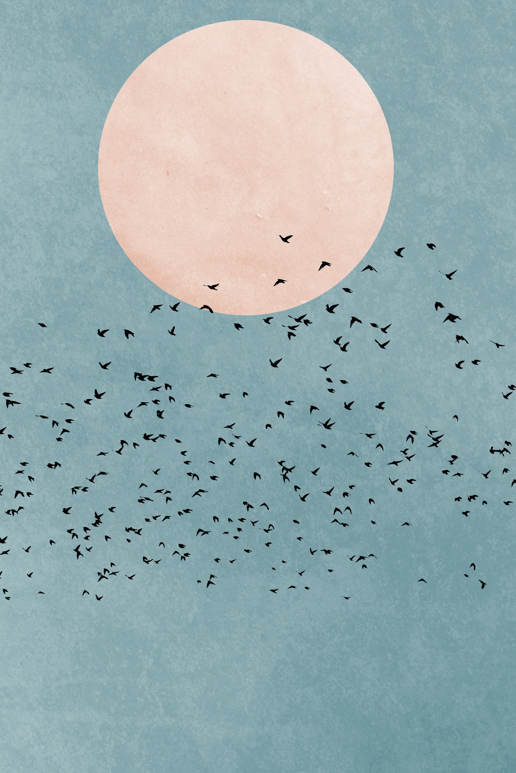 Let your spirit soar with Fly Away a serene and evocative wallpaper that captures the essence of freedom and escape. Against a textured, calming sky-blue backdrop, a pale, warm-toned sun or moon gently illuminates the scene. A flock of birds takes flight, their silhouettes elegantly drawn as they ascend towards the light, symbolizing the shedding of earthly constraints and the embracing of limitless possibilities. This minimalist design invites a sense of peace and tranquility into your digital space, prompting you to dream big and pursue your own horizons. "Fly Away" is a visual reminder that new beginnings and boundless adventures are always within reach, a perfect addition to create a calming and inspiring atmosphere on your devices.