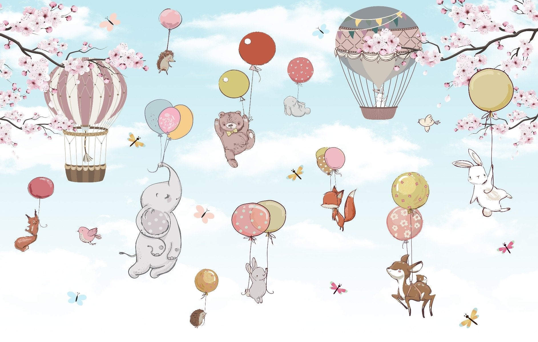 Let your child's imagination soar with our animals flying on balloons mural wallpaper. Your playroom will transform into a place where anything is possible. Vivid colors and charming animal characters adorn the mural, creating an exciting and fun atmosphere for your little ones. With this unique wallpaper, your kids will feel just like they're floating up in the clouds too. It's the perfect addition to any family home that wants to add a touch of creativity and wonder to their space. Experience the joy and whimsy of hot air balloons and animal friends with this playful wallpaper.