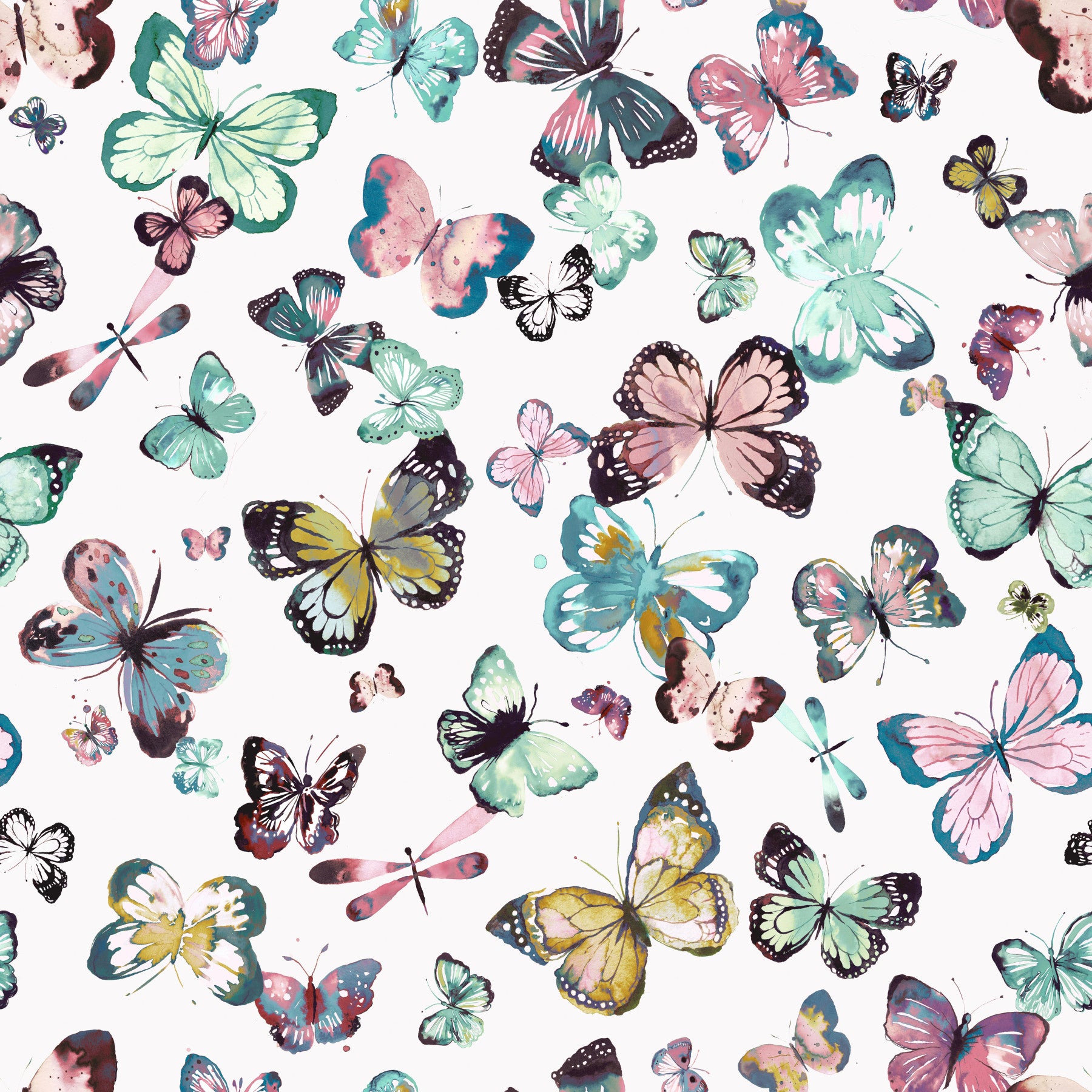 Flying butterflies wallpaper in green and pink pastels