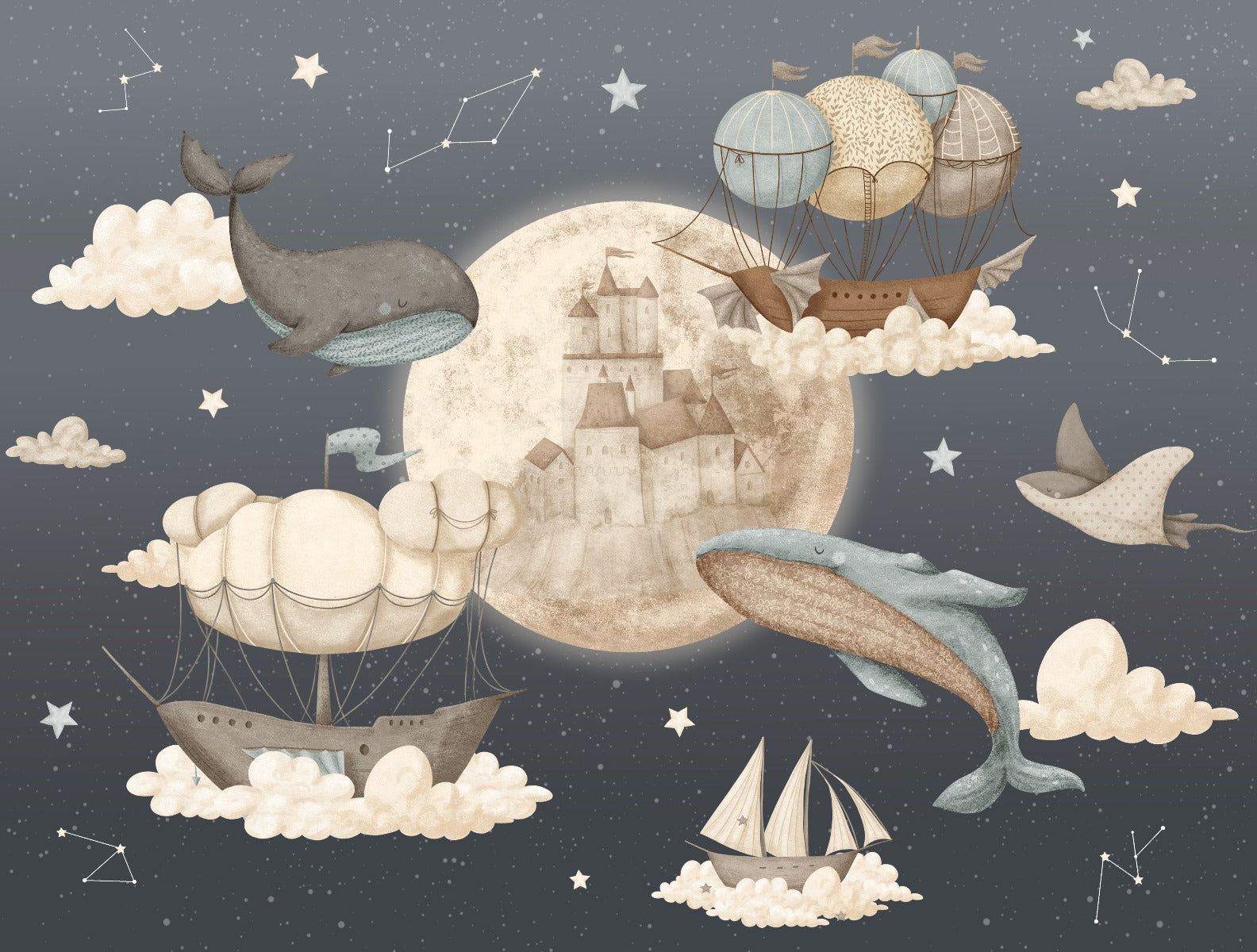 Our collection offers a unique voyage to a place where the wonders of the ocean sky blend seamlessly into the comfort of your child’s bedroom. The kids room wallpaper for Flying Whales Boat Wall Mural is not merely a design; it's a storytelling masterpiece that fuels the spirit of childhood with every glance. Here, mighty whales dance among the stars and historic ships brave the soft billows of clouds, all under the gentle watch of a silvery moon. It's a world alive with the promise of discovery, where each whale's leap and ship's journey unfolds a new chapter of adventure right before your child’s eyes.