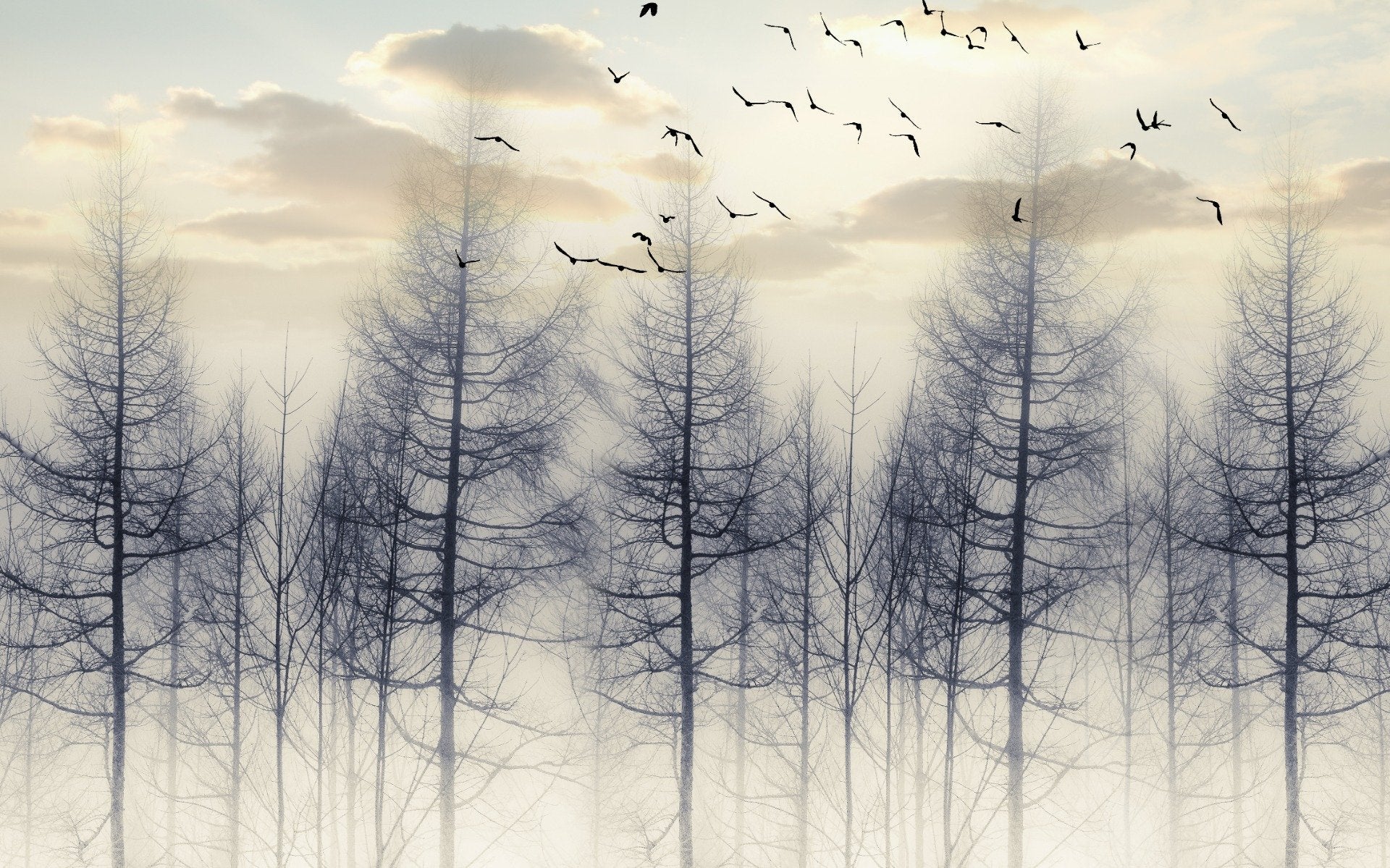 Step into the haunting atmosphere of a foggy spooky tree forest with this mesmerizing wallpaper. The gauzy fog drifts delicately between the gnarled trees, creating an eerie ambiance that will transport you to another world. Perfect for a living room wallpaper, this mural adds character and mood to any space. The mysterious trees will have you constantly discovering new shapes hiding within their branches - every glance revealing something new. This foggy wallpaper is the ultimate statement piece for those who crave dark romance in their decor. Immerse yourself in a macabre yet beautiful world with this stunning wallpaper.