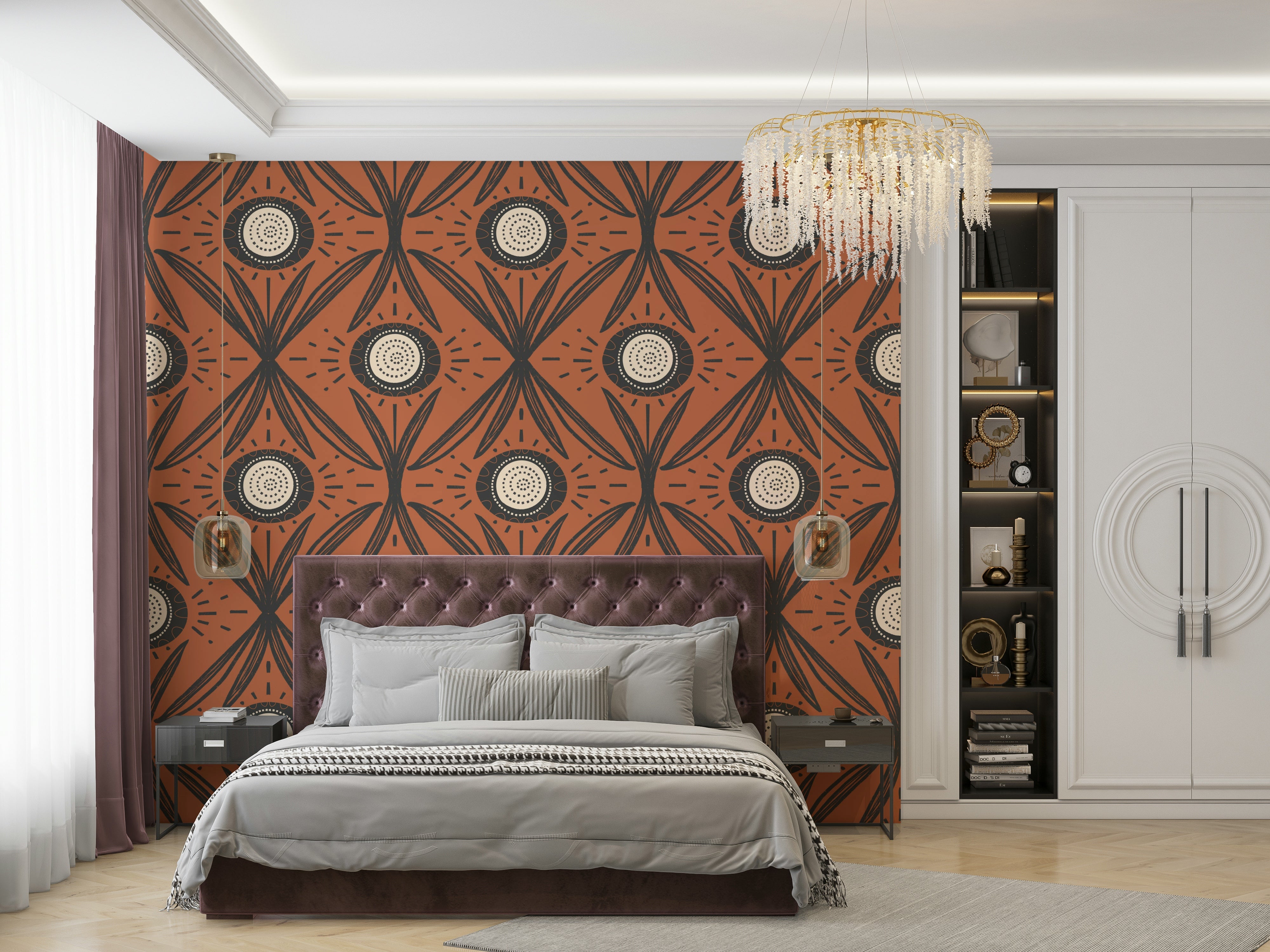 Evoking a sense of nostalgic charm, this 'Folk Bloom Radiance' wallpaper features a captivating retro contrast floral pattern. Bold charcoal outlines define stylized petals and radiant sun-like blossoms against a warm terracotta backdrop, creating a visually striking and inviting design. The folk-inspired motifs bring a touch of artisanal beauty, while the contrasting colors add a modern edge. This wallpaper balances rustic appeal with contemporary aesthetics, making it perfect for adding a touch of warmth and character to any space.