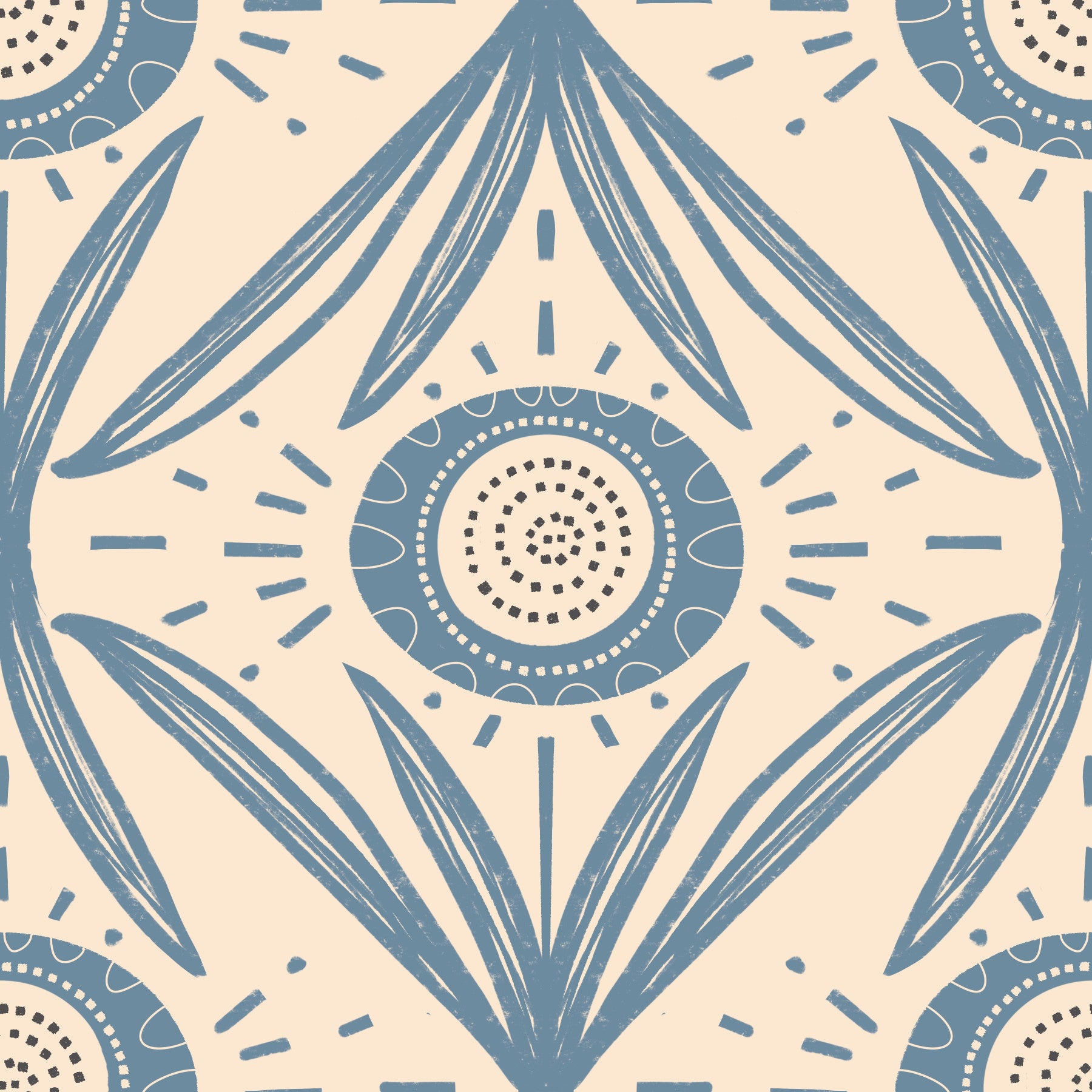 Evoke a sense of retro charm with "Folk Bloom Radiance Dusty Blue", a mid-century floral wallpaper. This design features stylized floral motifs and radiant sun-like elements in a muted, dusty blue hue, set against a soft, neutral backdrop. The folk-inspired patterns and geometric arrangements create a visually engaging composition, perfect for adding a touch of vintage elegance to any space. The subtle textures and understated color palette bring a calming radiance, making it an ideal choice for bedrooms, living rooms, or any area where you desire a serene yet stylish ambiance.