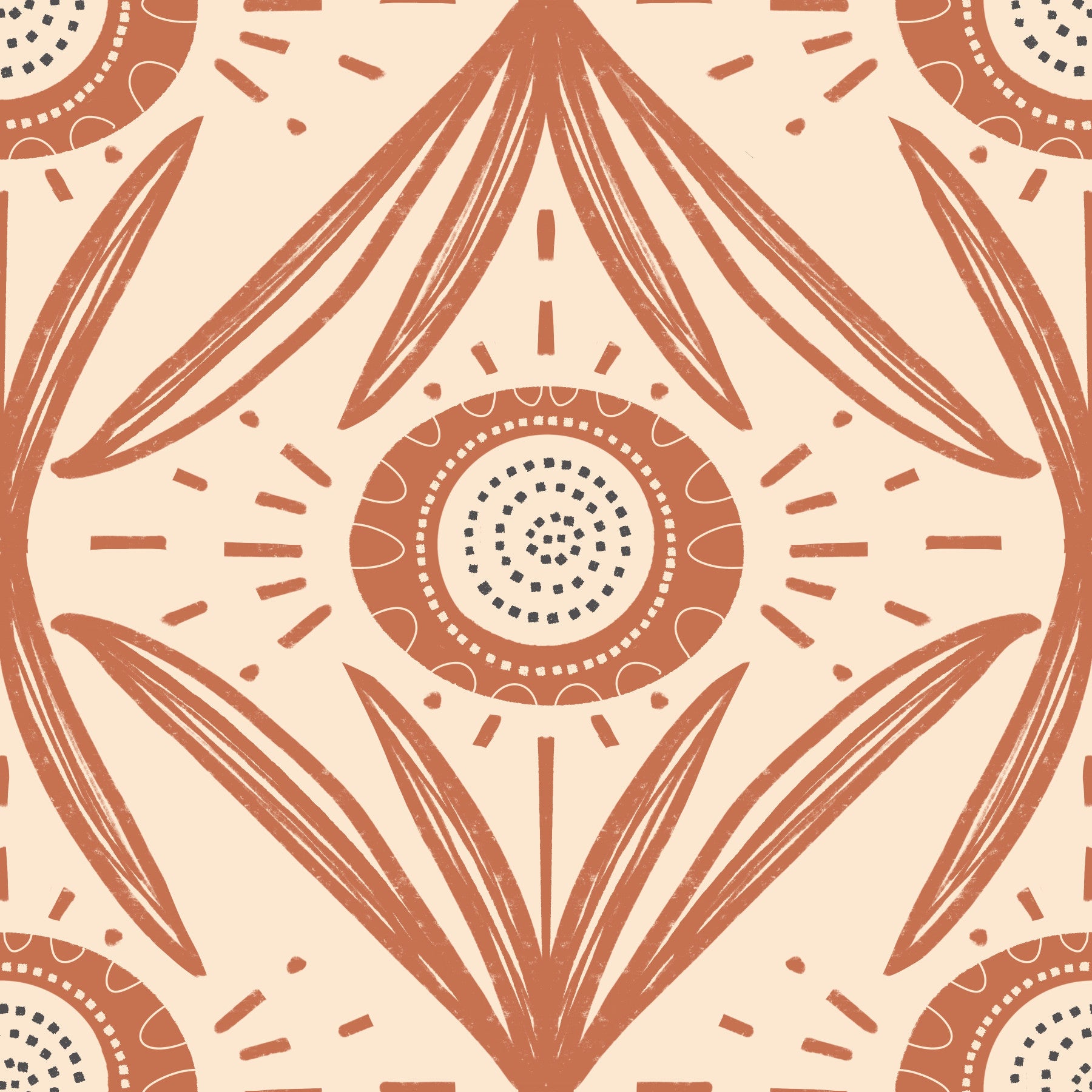 Embrace the warm, inviting essence of "Folk Bloom Radiance Terracotta", a retro-inspired floral wallpaper. This design evokes a sense of cozy cottage charm with its hand-drawn aesthetic and earthy terracotta tones. Simplified blooms and radiating sun-like motifs create a balanced, symmetrical pattern. The rustic texture adds depth and character, reminiscent of vintage textiles and folk art. Perfect for creating a warm, inviting atmosphere in any space, this wallpaper radiates a timeless appeal, blending traditional motifs with a contemporary feel.