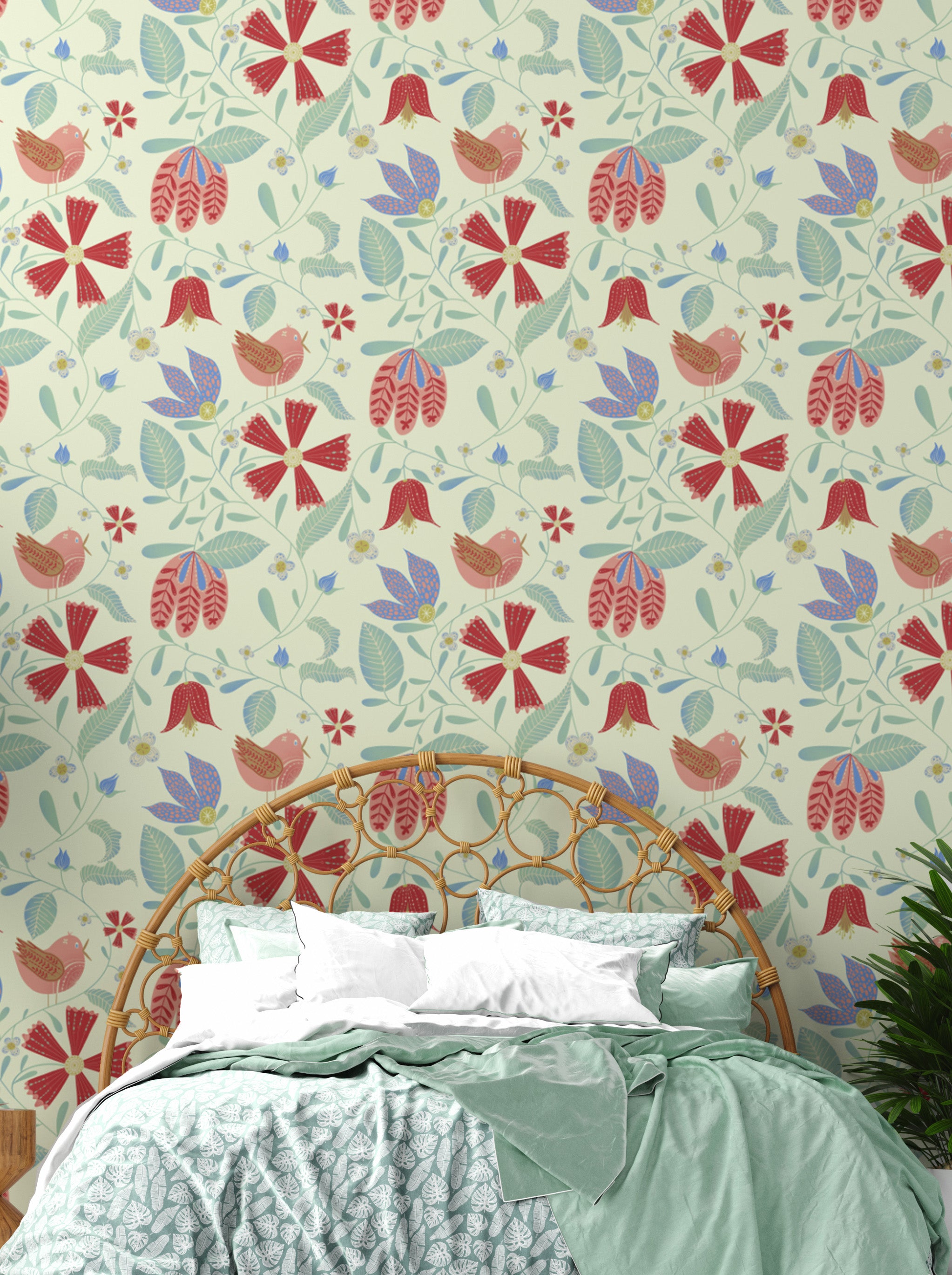 Decorative folksy birds wallpaper for unique and cozy spaces.
