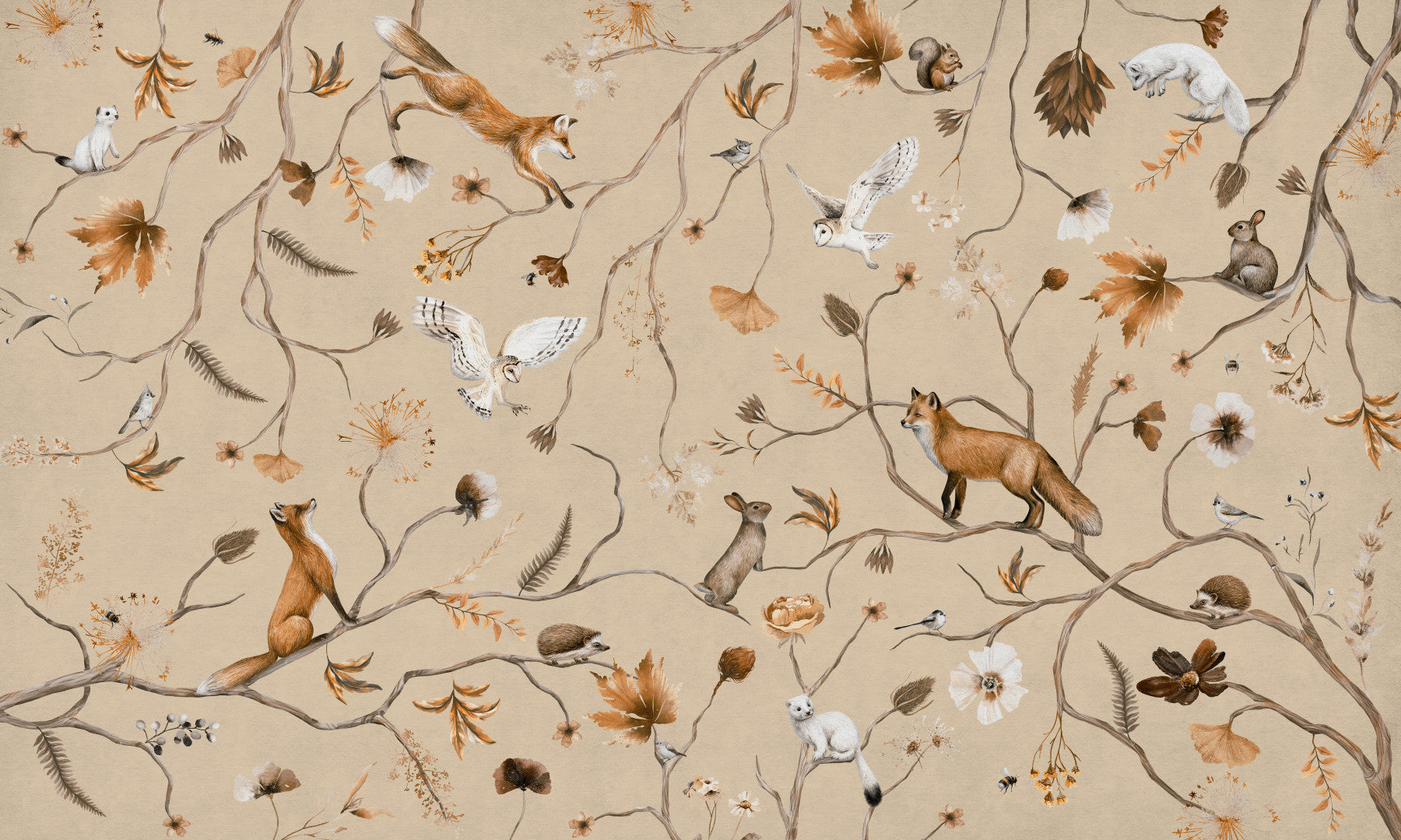 Embark on a whimsical journey into the heart of the woods with Forest Creatures. This enchanting wallpaper unveils a serene woodland scene teeming with life. Delicate branches intertwine, serving as perches for foxes, stoats, squirrels, rabbits, hedgehogs, owls and tiny birds. Autumnal leaves in warm, earthy tones of brown and gold dance amongst the branches, creating a cozy and inviting atmosphere. Soft white flowers add a touch of ethereal beauty to the rustic setting. The overall design evokes a sense of peaceful observation, inviting you to pause and appreciate the beauty of nature. "Forest Creatures" is perfect for creating a calming and sophisticated ambiance in any room, transforming your space into a tranquil haven inspired by the wonders of the natural world.