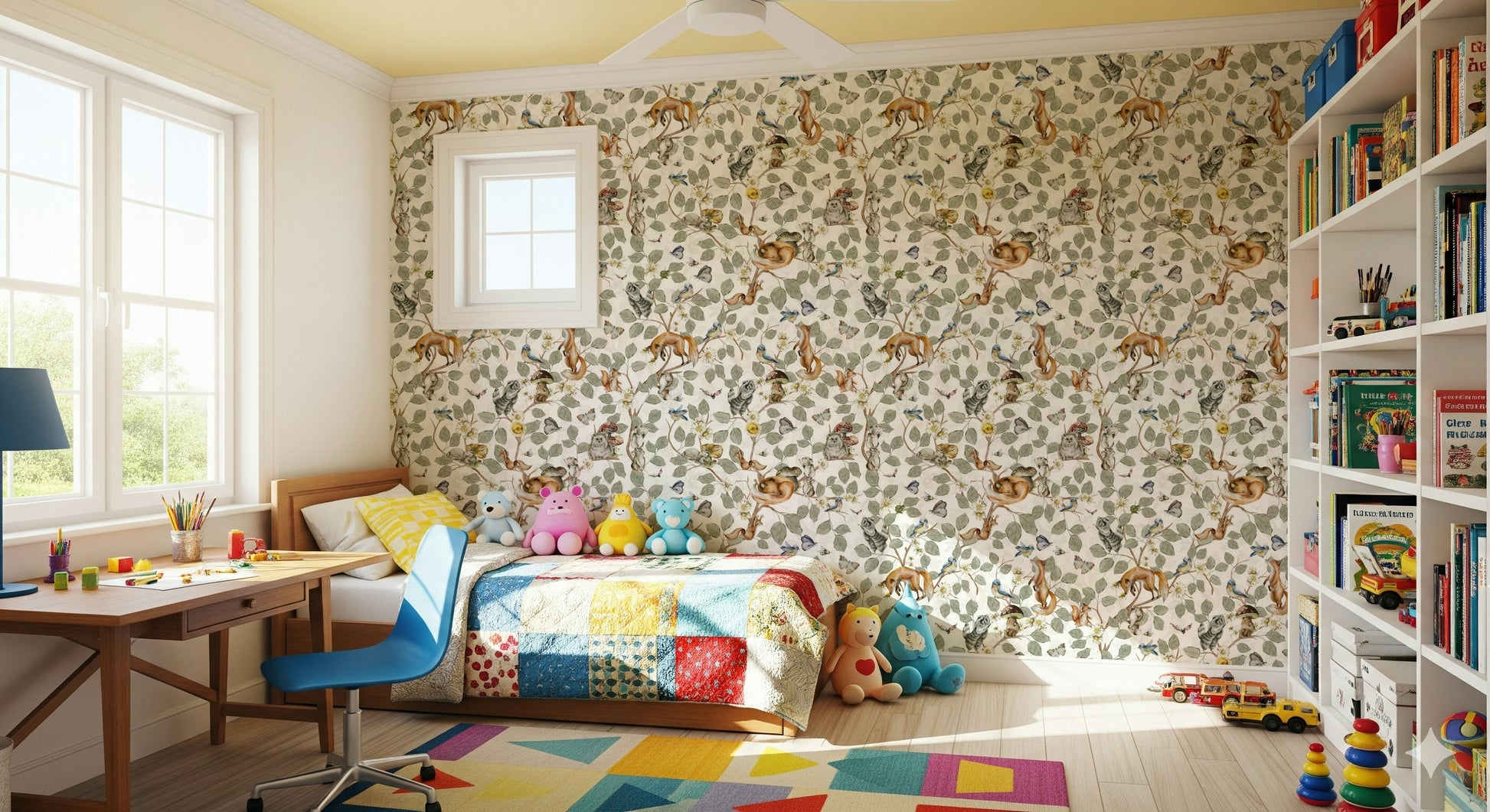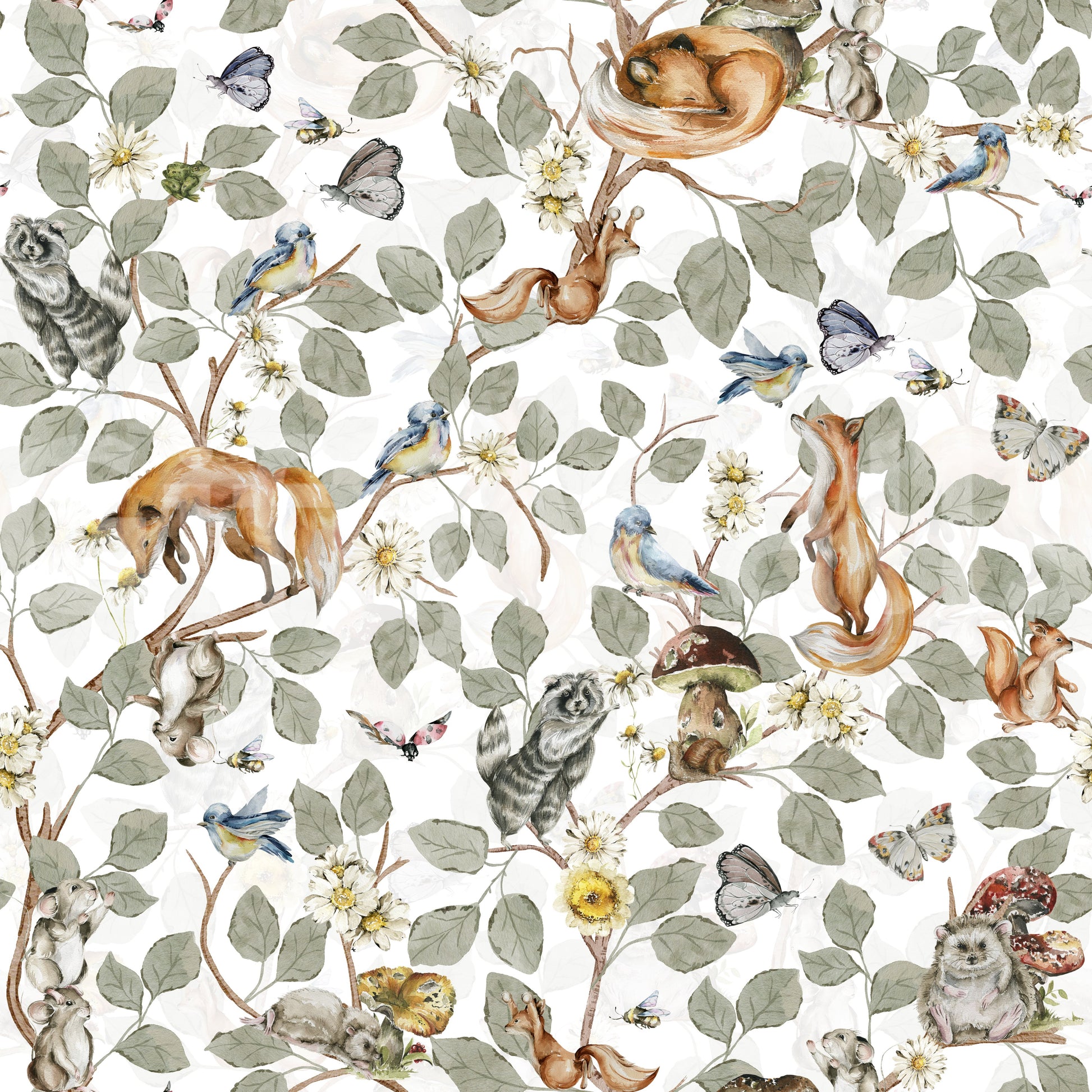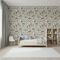 Invite friendly critters into your home with this enchanting forest-themed wallpaper by Uta Naumann. The design showcases a charming array of watercolour animals such as foxes, squirrels, and birds amidst lush foliage and petite daisies. The gentle colour palette, featuring soft greens, browns, and a hint of blue, fosters a peaceful ambiance. Perfect as wallpaper for walls in a nursery, playroom, or bedroom, this pattern connects interiors with nature, creating a cosy and comforting space.