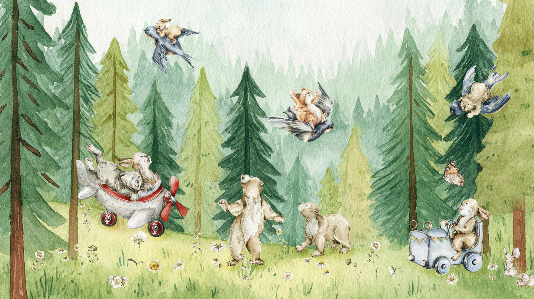Introduce a world of whimsical wonder to your little one's space with the Forest Friends Take Flight mural wallpaper. This enchanting watercolor design captures a delightful scene of woodland creatures on an exciting adventure. Adorable bear cubs and playful bunnies are shown soaring through the pine forest canopy, utilizing everything from a charming toy airplane to friendly birds! Perfect as a vibrant centerpiece, this high-quality wall mural instantly creates a peaceful, imaginative, and gender-neutral environment. Its sweet aesthetic makes it the ideal wallpaper for walls in a baby nursery, playroom, or child's bedroom. Let their imagination take flight with these courageous forest friends.