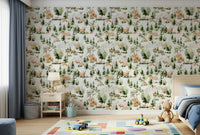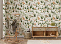 Transform your room into a tranquil woodland with this charming watercolour design by Uta Naumann. It displays a repeat pattern of wildlife inhabiting a lush forest scene of mountains and trees. The earthy tones and soft watercolour style provides a calming and playful atmosphere. This wallpaper for walls is a great option for nurseries, bedrooms, or any room where a touch of nature is desired. It will enhance your interiors with a rustic and outdoorsy feel.