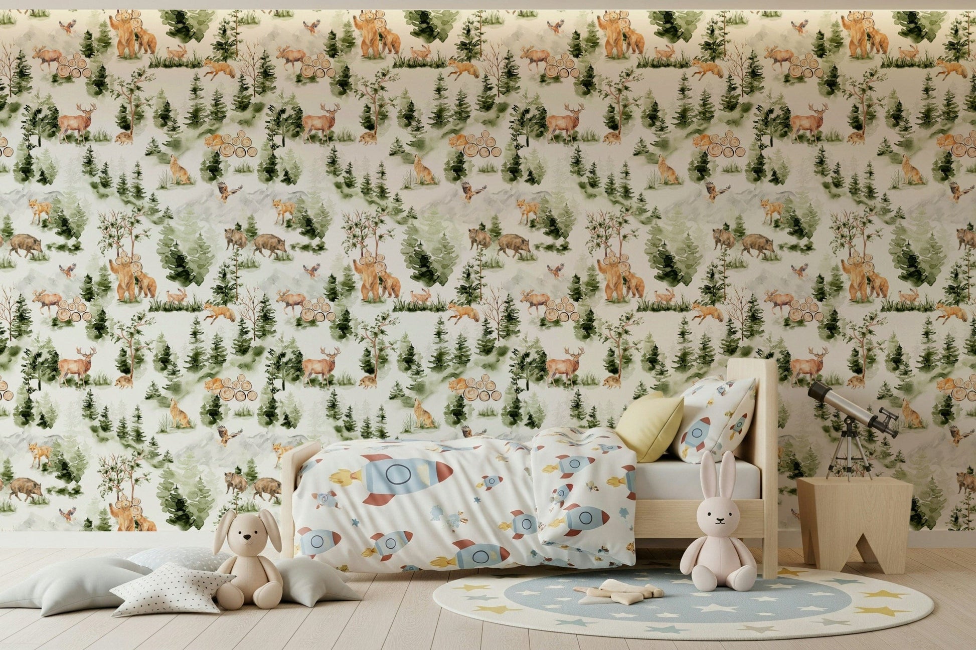 Forest Friends wallpaper with watercolor animals, moose, and wild boar.