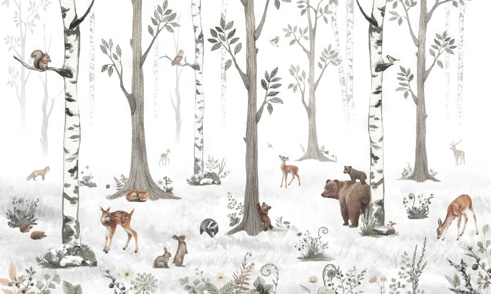 Stylish forest wallpaper with birch trees and animals