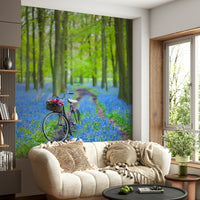 Bicycle in spring forest. Embark on a serene journey with "Forest Path Discovery," a wallpaper that invites you to escape into a tranquil woodland scene. The image captures a vintage bicycle, its basket brimming with vibrant tulips, resting beside a path that winds through a sea of enchanting bluebells. Sunlight filters through the lush green canopy, creating a magical ambiance and illuminating the delicate floral carpet. This wallpaper evokes a sense of peaceful exploration and the simple joys of nature. Perfect for bringing a touch of springtime wonder into any space, "Forest Path Discovery" is a visual reminder to slow down, appreciate the beauty around us, and embrace the adventure that awaits on the road less travelled. Let this scene transform your screen into a portal to a secret garden, fostering a sense of calm and inspiring daydreams of idyllic escapes.