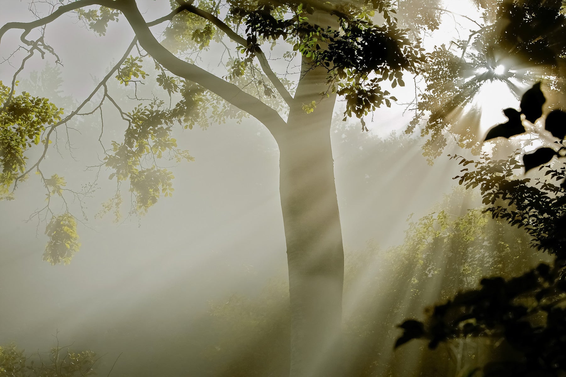 Forest Serenity wallpaper Exquisite tree silhouette, sunlit fog, soothing scenery.