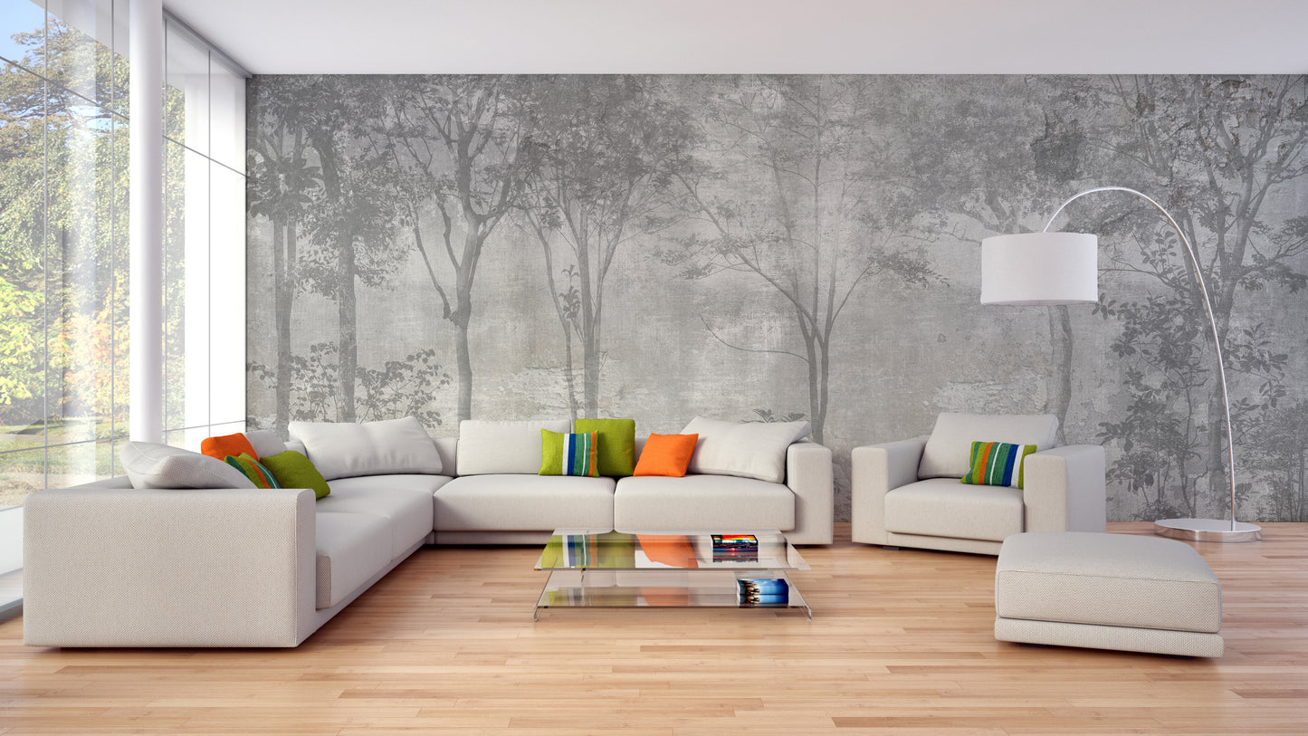 Bring the beautiful wilderness into your home with this stunning grey color forest trees mural wallpaper! This grey wallpaper provides the perfect backdrop for the detailed forest imagery, complete with tall trees and delicate leaves. Adding this forest wallpaper to your living room will create a serene and calming ambiance, transporting you straight into nature. The intricate design and muted color palette make this wallpaper a versatile choice, fitting seamlessly into any existing decor. With this grey colour forest trees wallpaper, you'll feel like you're surrounded by the peacefulness of the forest in the comfort of your own home.