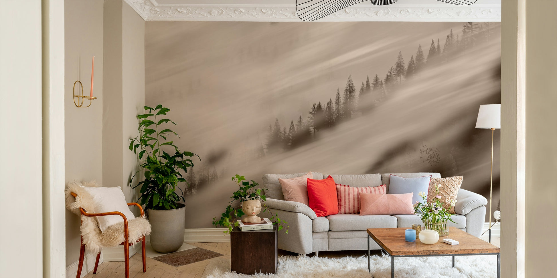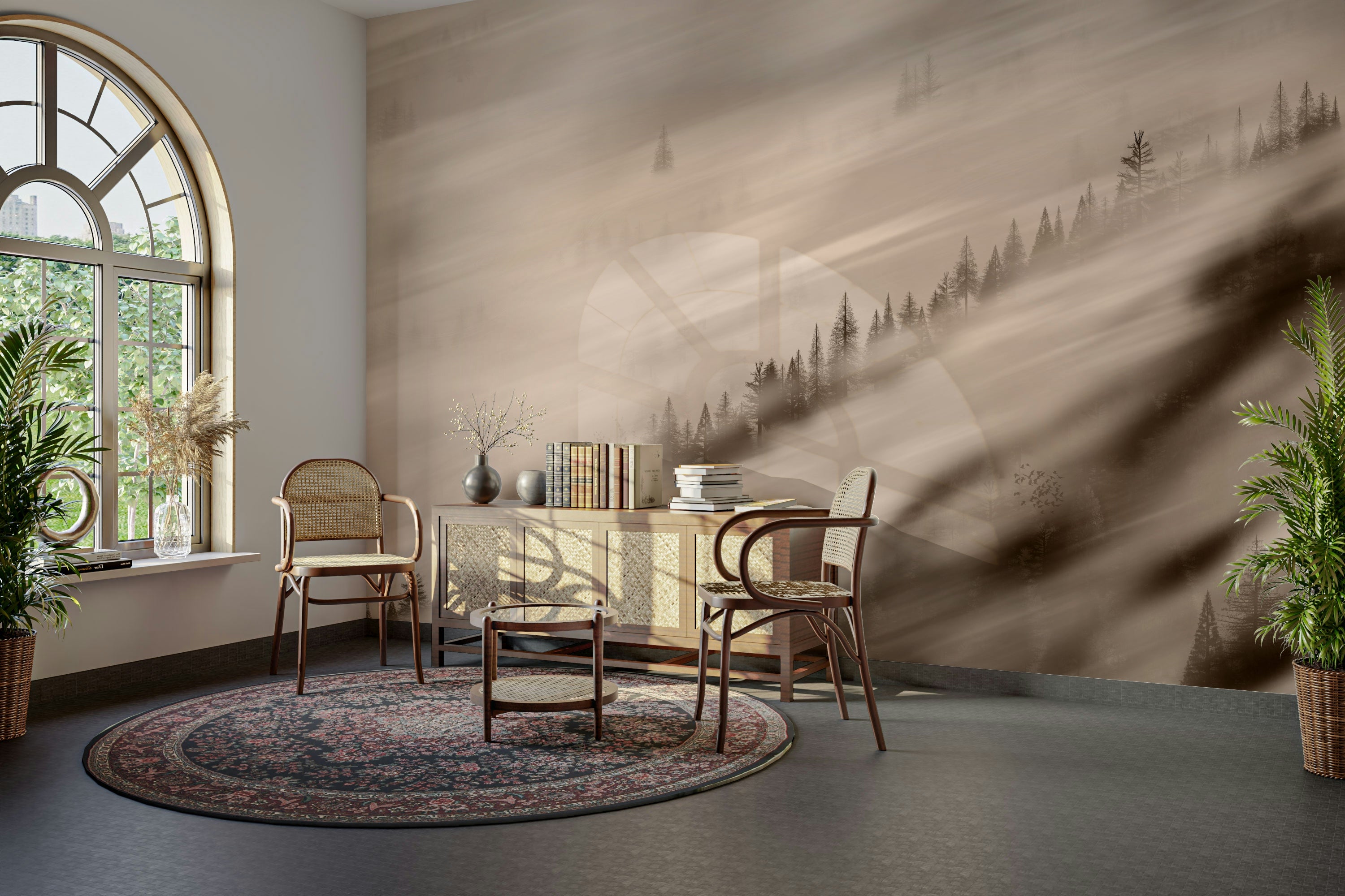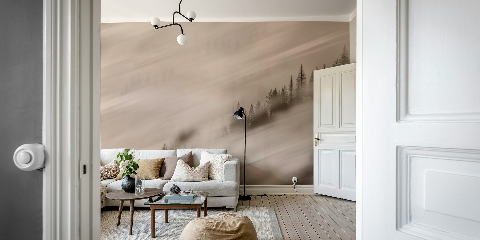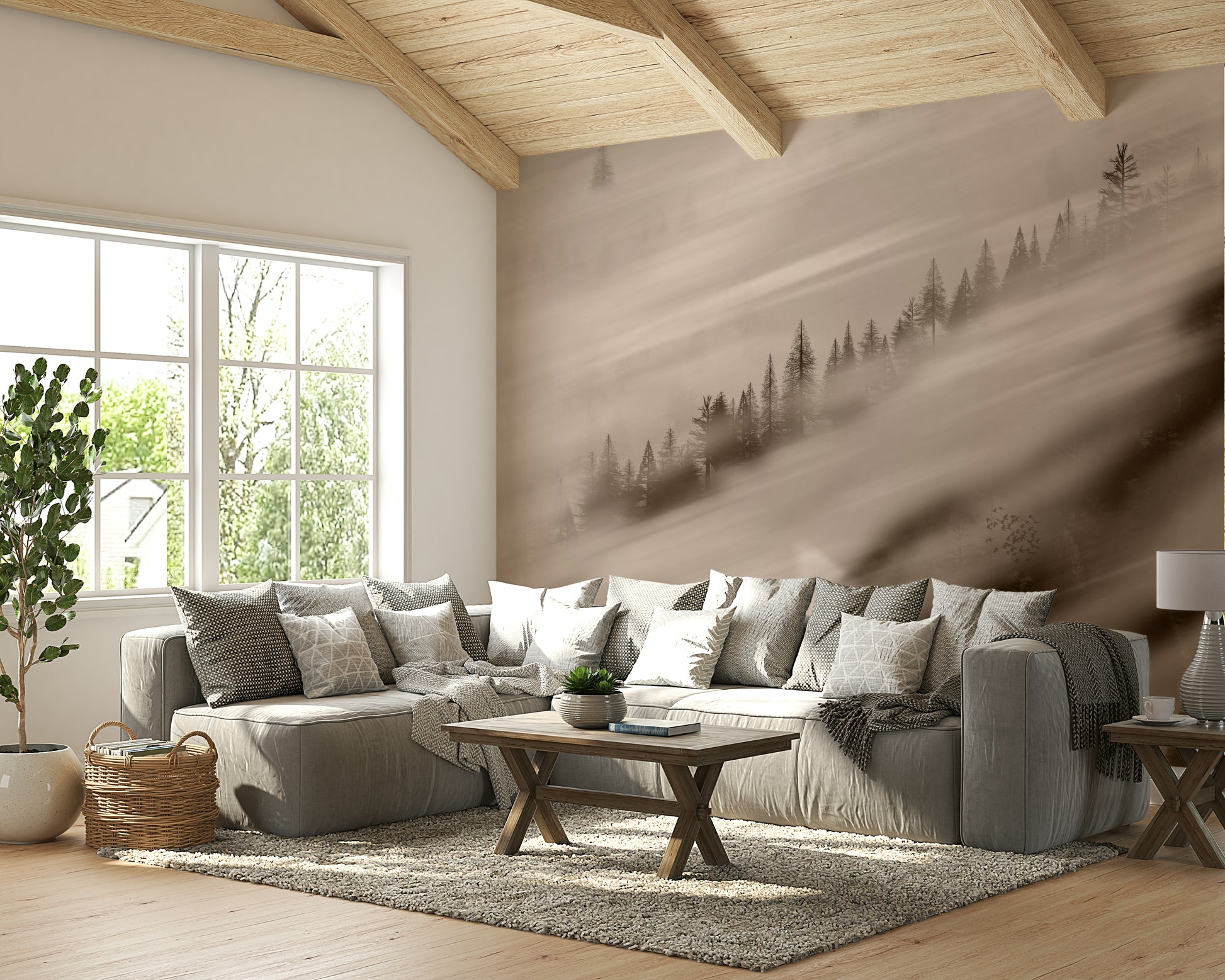 Misty sepia forest mural – Forest Valley Sepia Wallpaper