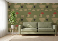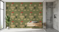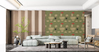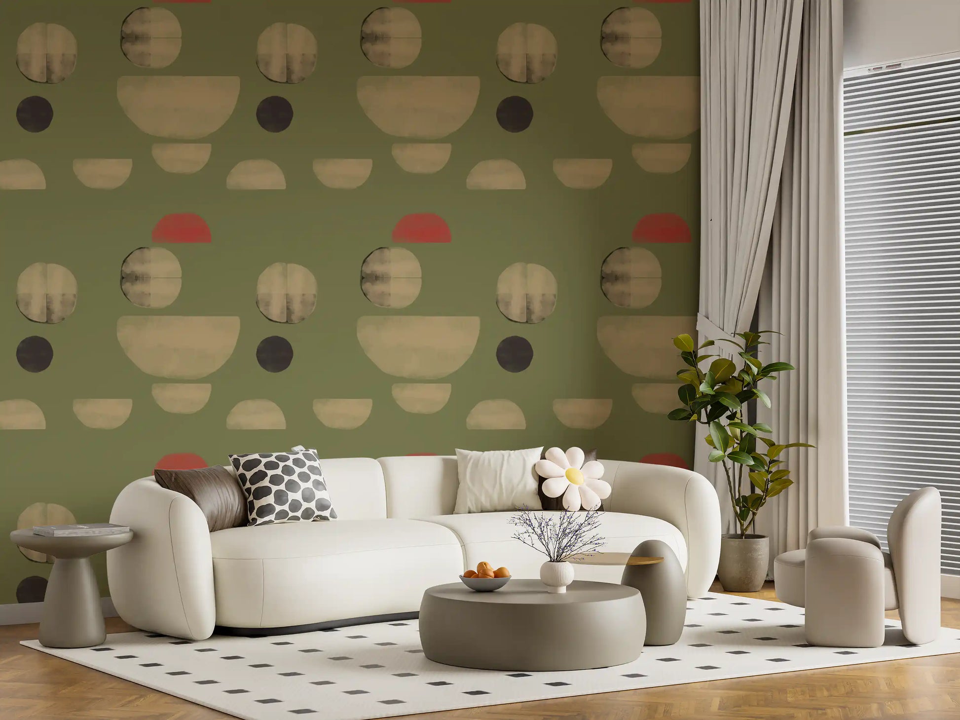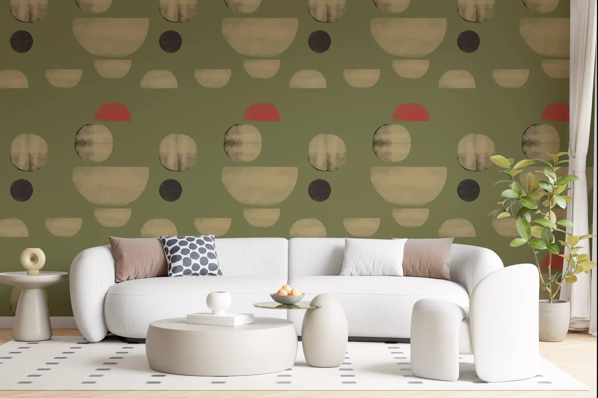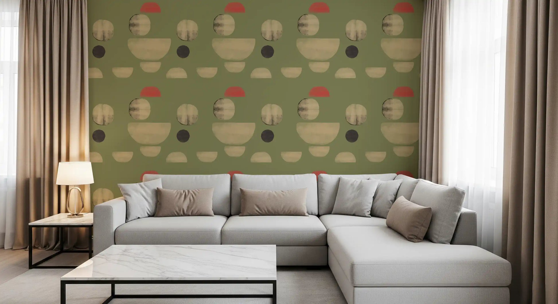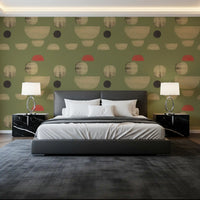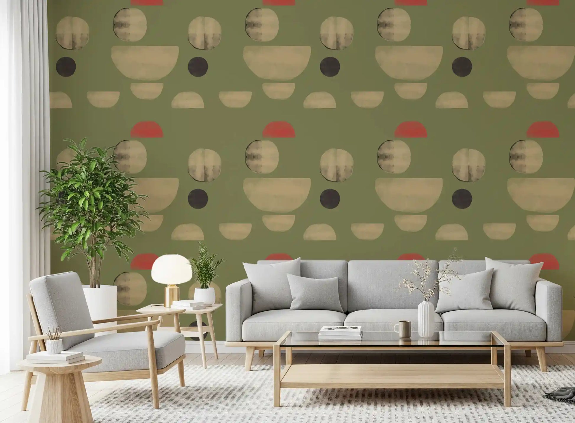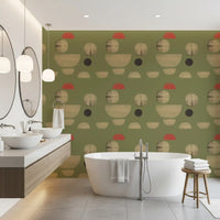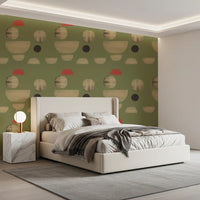 Transform your living space with this captivating abstract wallpaper for walls. Its unique design features an array of organic and geometric shapes, including soft circles and graceful semicircles, scattered across a serene olive green background. Muted beige tones create a sense of calm, while unexpected touches of coral red add a vibrant, modern accent. This distinctive pattern offers a sophisticated, hand-painted texture, lending depth and character to your walls. Perfect for living rooms, dining areas, or a stylish home office, it introduces contemporary artistry and a balanced colour palette. This wallpaper elevates any interior, complementing both minimalist and mid-century modern décor with effortless elegance.