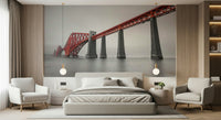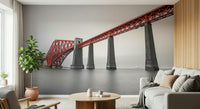 Forth Rail Bridge, Scotland. Elevate your space with this architectural marvel. This wallpaper for walls presents a dramatic view of a striking red bridge, its intricate steel structure sharply contrasted against a muted grey backdrop. The long exposure creates a serene water surface. The selective colour draws the eye, making it a captivating focal point in any room. It works well in modern living rooms, studies, or even hallways seeking a touch of industrial chic. The composition and tones add depth to interior spaces, enhancing their sense of scale and artistry.