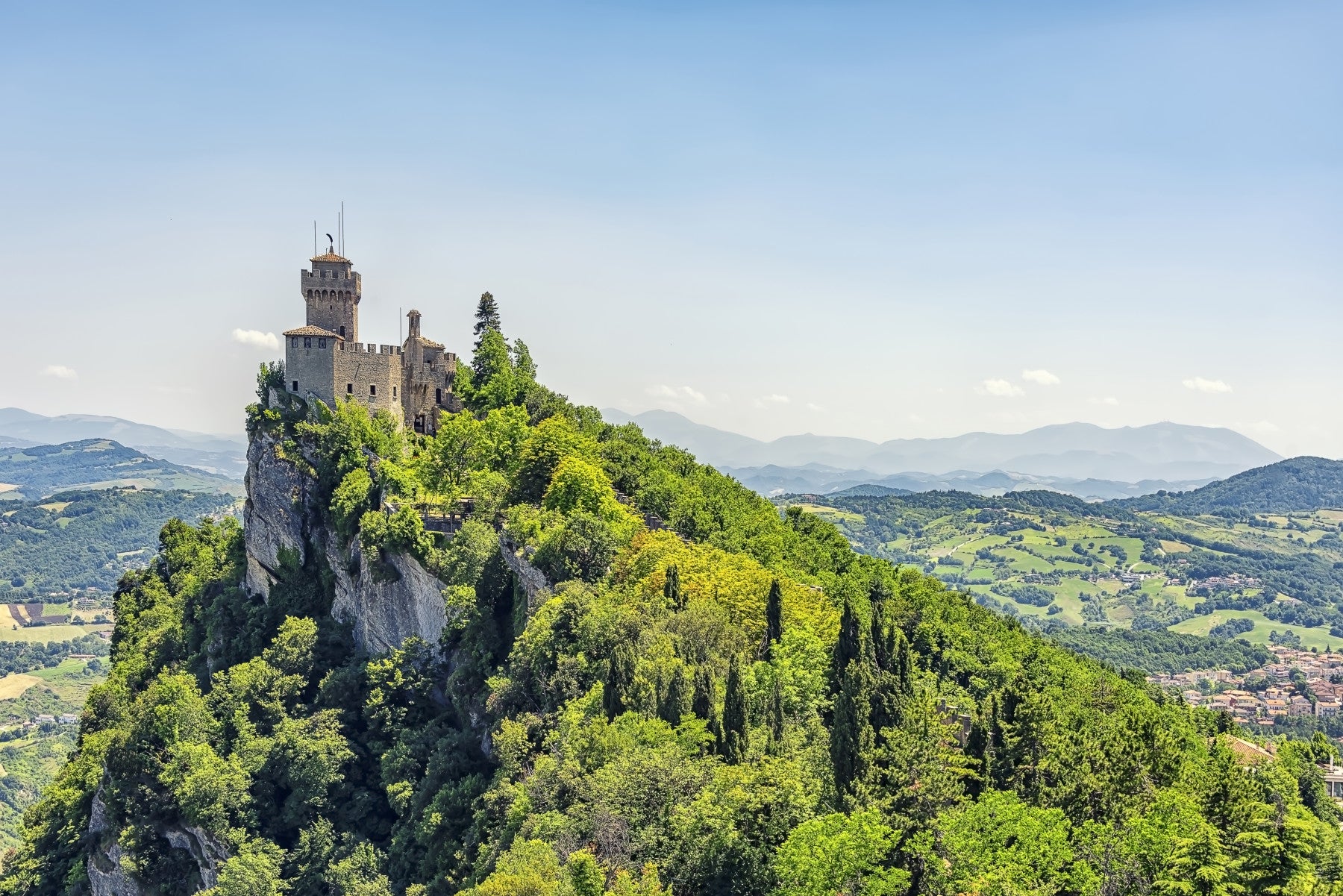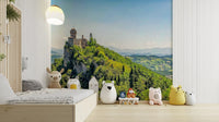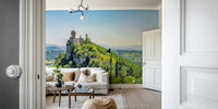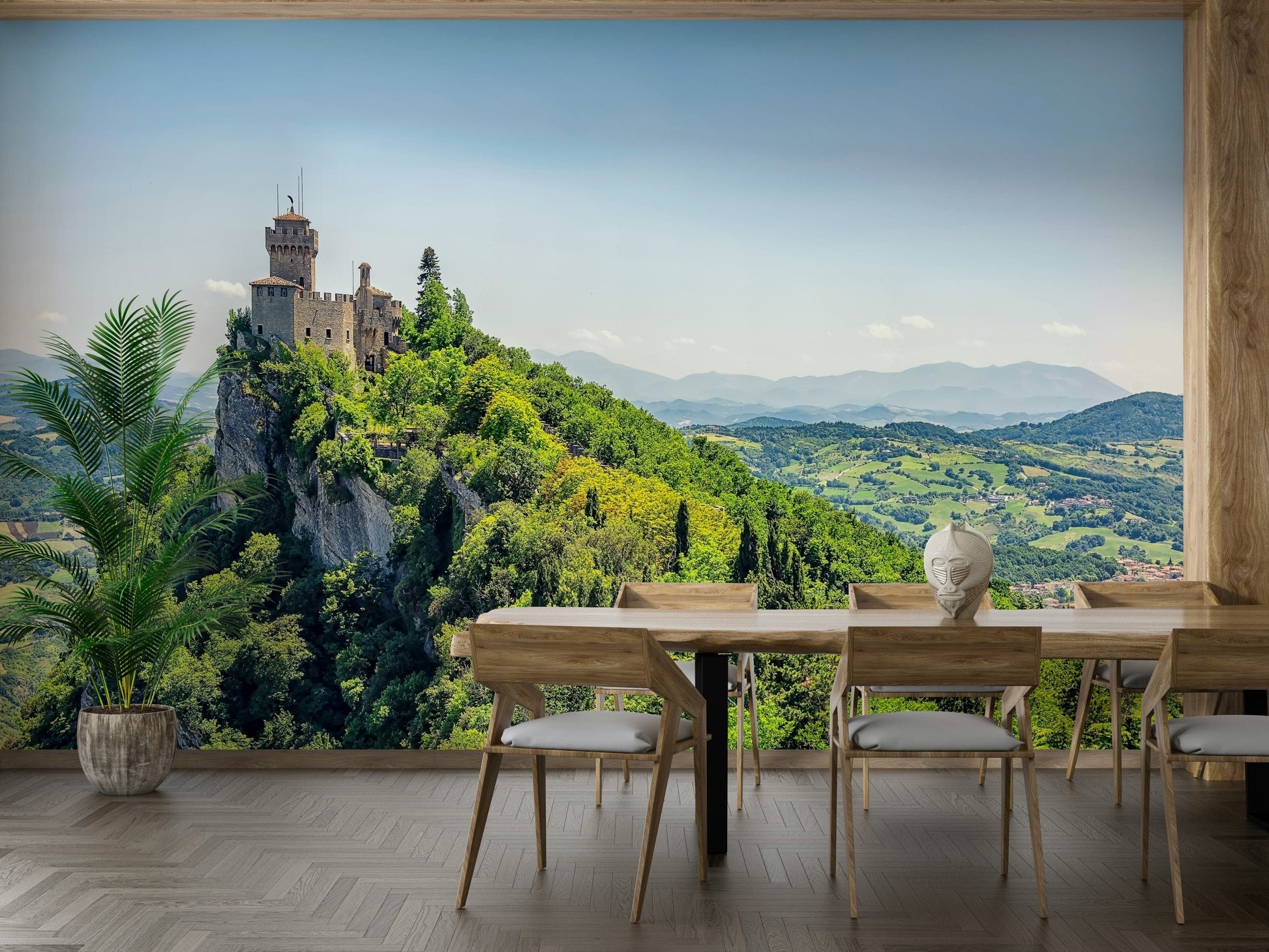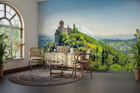 This captivating wallpaper features an ancient fortress dramatically set against a backdrop of rolling hills. Greenery covers the foreground, with distant mountains blurring into the light-blue horizon. The mix of architectural and natural elements brings a touch of old-world wonder to modern living spaces. Employ this sophisticated wallpaper for walls in your entryway, living room, or library to establish a focal point that connects the outdoors and indoors with stunning elegance.