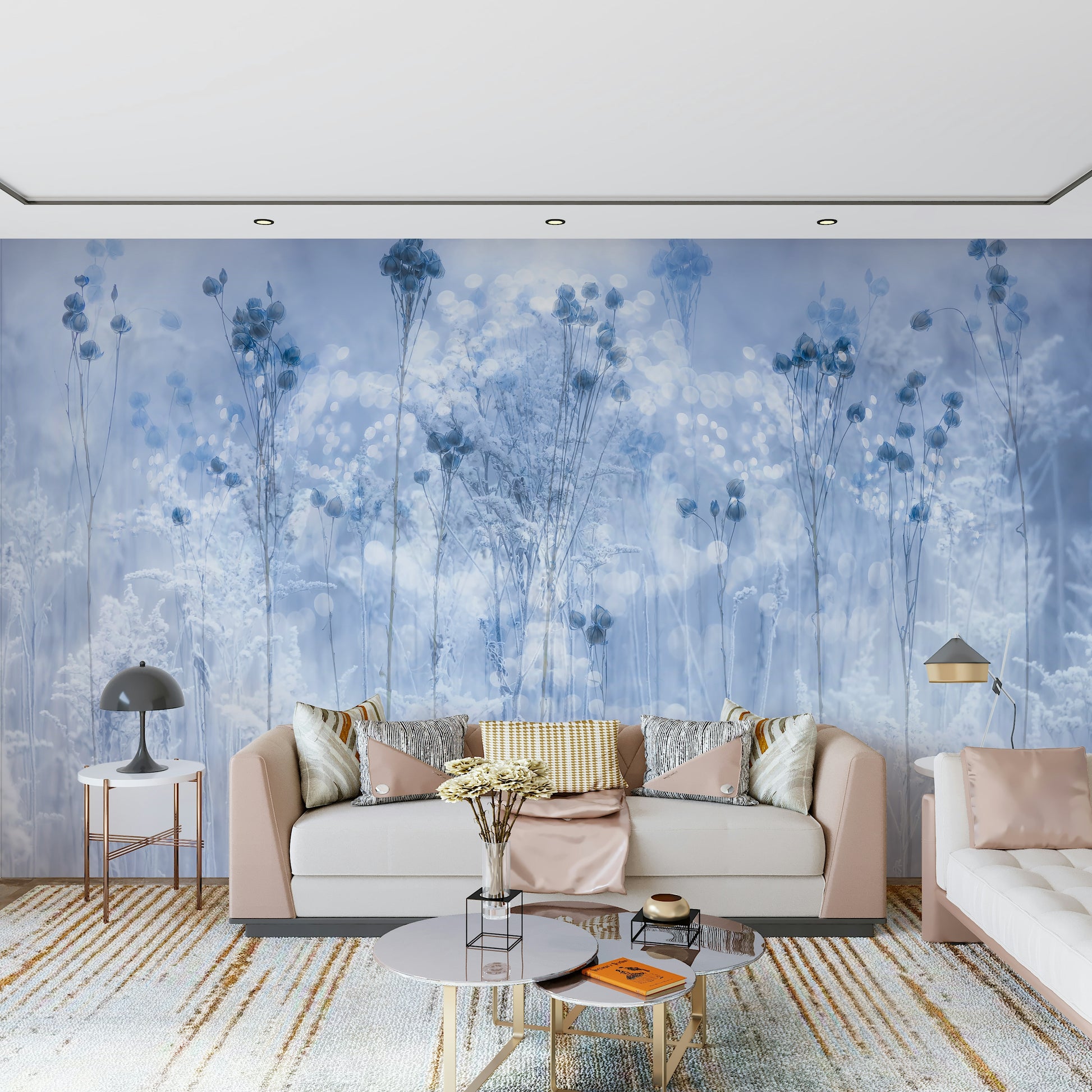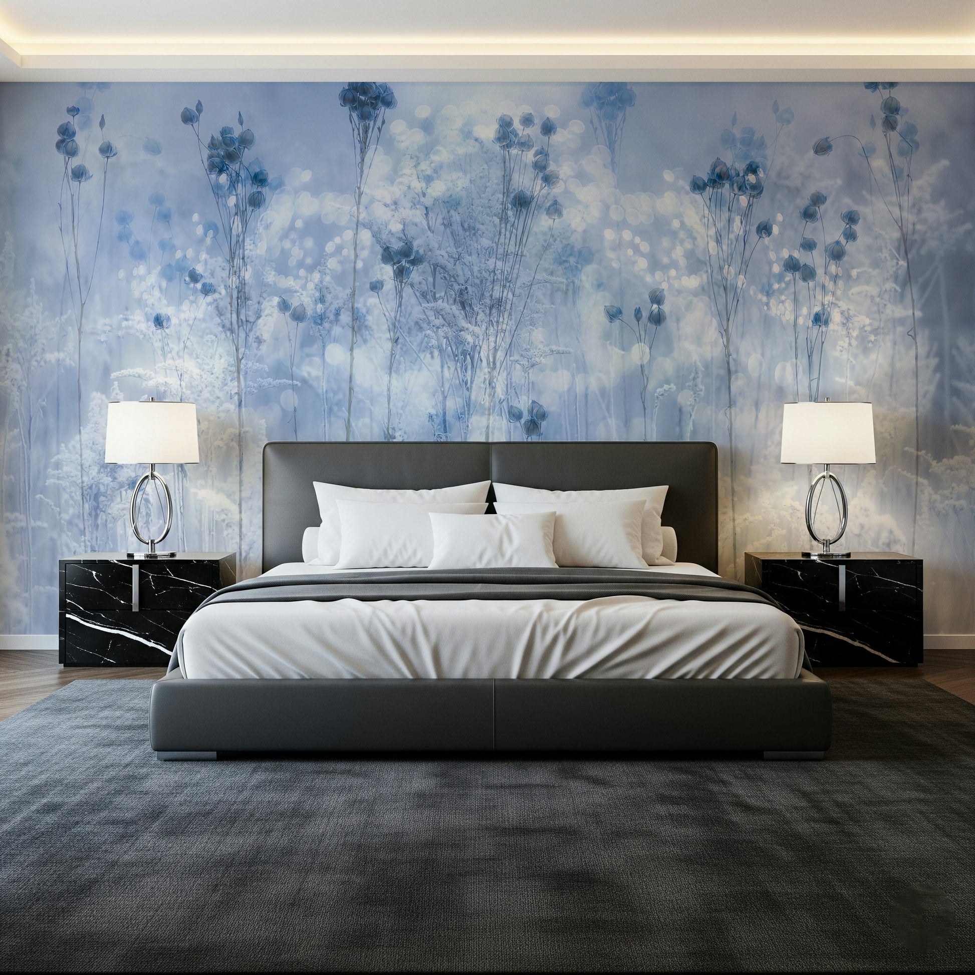 Bring a dreamy ambiance into any room with this beautiful wallpaper for walls. The gentle, frost-kissed botanical scene in pale blues and whites invites serenity. This elegant design makes a statement in bedrooms or bathrooms, adding a peaceful atmosphere. Imagine waking up to this calming landscape every morning. It works well in any minimalist or Scandinavian-inspired interior, creating a soothing, stylish retreat. The blurred effects amplify the soft aesthetic, giving a dreamy quality.