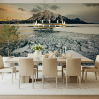 Witness nature's spectacle with this frozen lake wallpaper. The methane bubbles, trapped beneath the ice, create a fascinating pattern against the backdrop of snow-capped mountains. Hues of blue, white, and gold merge in a serene vista. The crisp, cool tones bring a breath of fresh air to any room. Use this wallpaper for walls in your living room or office and let the unique design elevate your interiors. This wallpaper offers a calming touch to busy spaces.