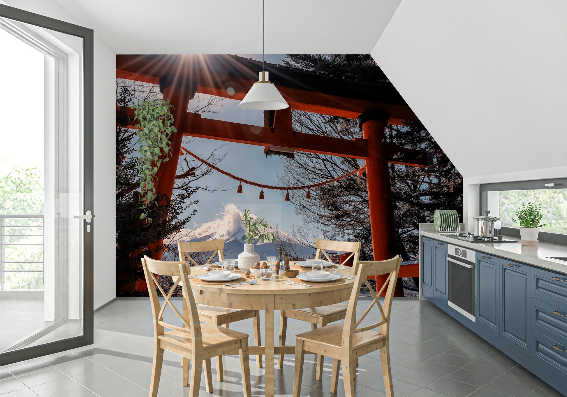 Capture a sense of serenity with this striking wallpaper for walls. This image showcases a vibrant orange torii gate against the backdrop of Mount Fuji. The sun bursts through the sky, filling the scene with warmth. The contrasting black branches add texture, while the snow-capped mountain offers a tranquil escape. This wallpaper brings a touch of Japanese beauty to your living room, bedroom, or hallway, creating a peaceful and refined ambiance. This photo will complements minimalist or nature-inspired interiors.
