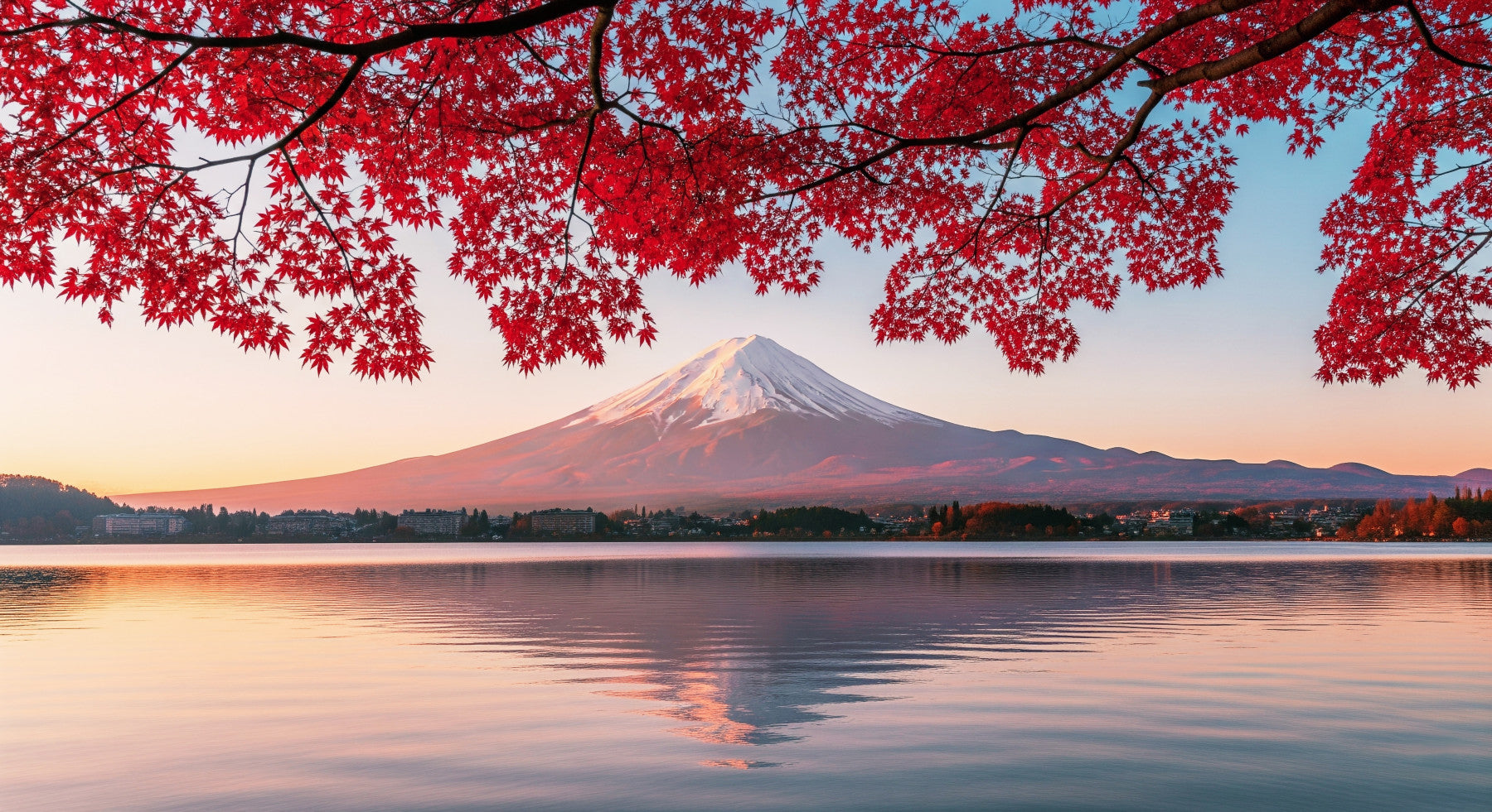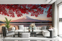 Capture the essence of autumn with this scenic vista turned into wallpaper for walls. Fiery red leaves cascade around majestic Mount Fuji, reflected in still waters. The warm tones and tranquil composition create a cosy and inviting ambiance. Ideal for a bedroom or study, this wall décor transforms any space into a serene retreat. It adds depth and visual interest, easily complementing minimalist or maximalist aesthetics. This wallpaper offers a striking focal point that inspires contemplation and brings the beauty of nature indoors.