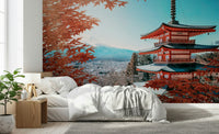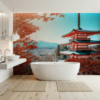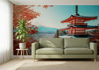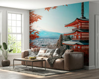 Elevate your home's ambience with this beautiful depiction of a pagoda under a clear sky, framed by autumnal foliage. Distant mountains offer a scenic backdrop, ideal for creating a calming atmosphere in any room. This wallpaper for walls makes an ideal addition to a living room, bedroom, or office, imparting a sense of peace and sophistication. The combination of traditional architecture and natural elements works well with modern decor, promoting a balance of style and serenity throughout your interiors.
