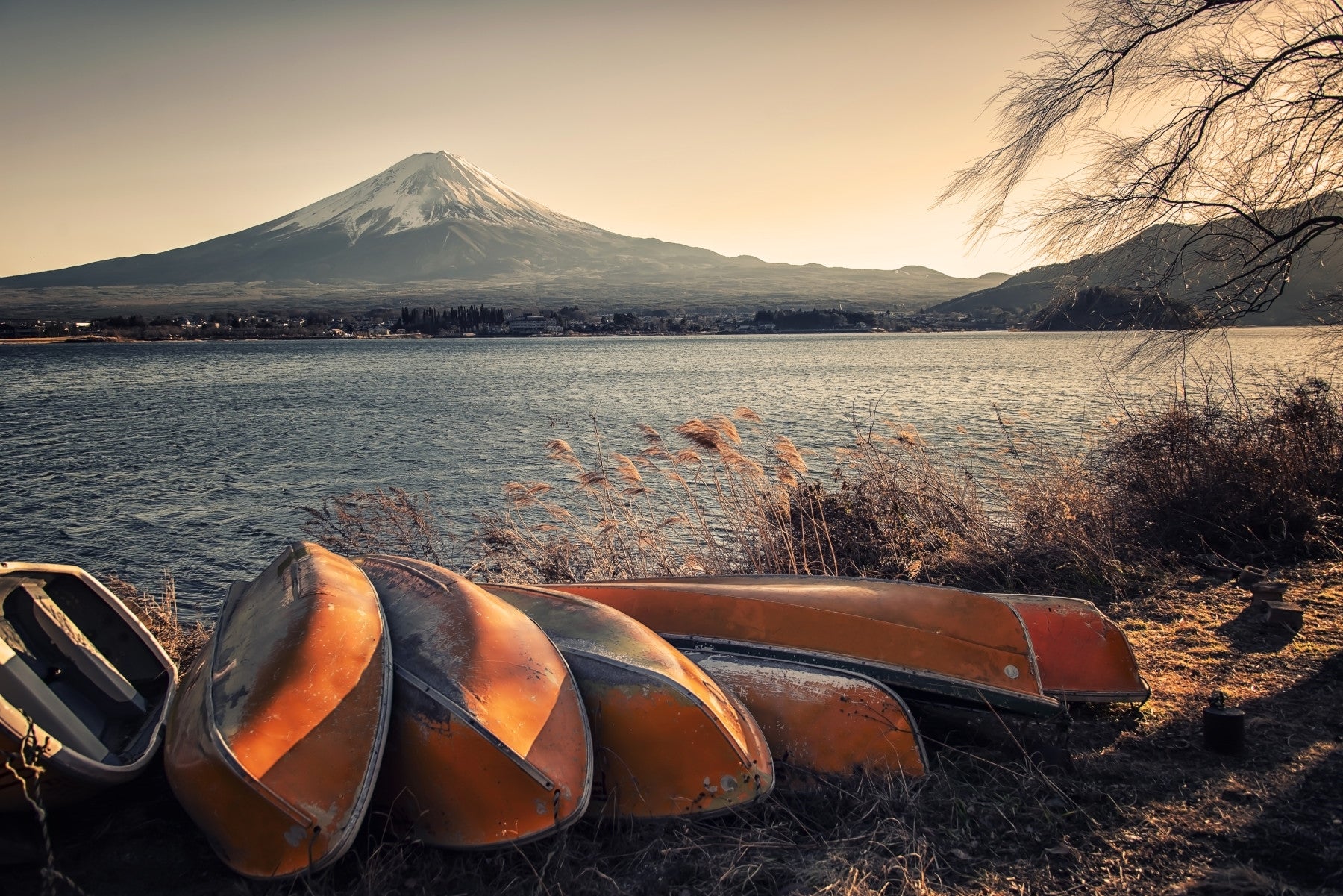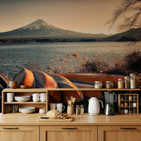 Bring serene Japanese scenery into your home with this tranquil wallpaper for walls. Gaze upon Mount Fuji's snow-capped peak reflected in calm waters, while rustic boats rest ashore. The warm orange tones of the boats contrast beautifully with the cool blues of the lake and sky. This wallpaper creates a peaceful atmosphere, ideal for bedrooms, living rooms, or home offices. It complements minimalist, rustic, or nature-inspired interiors, adding a touch of quiet elegance to any space.