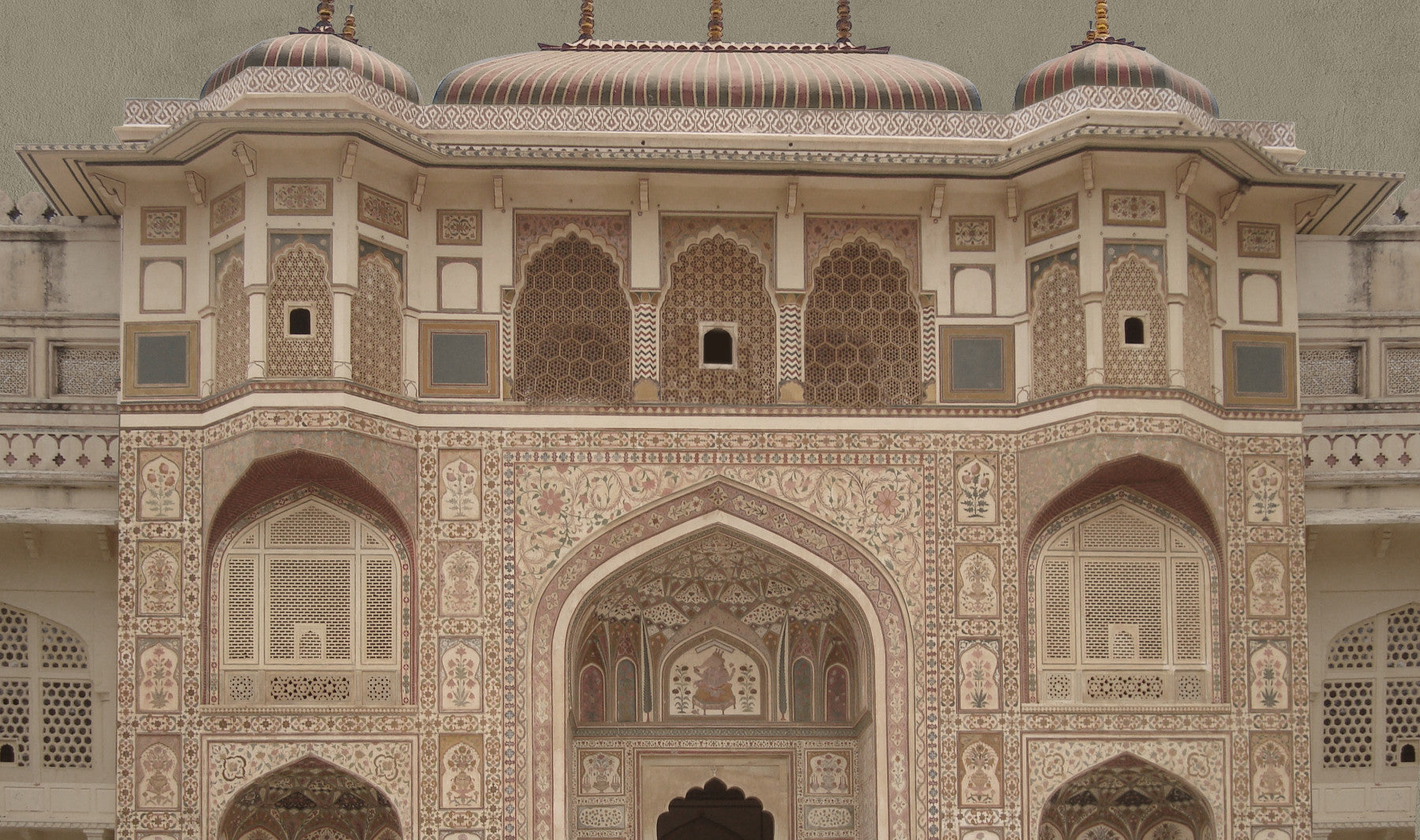 Step into a world of regal artistry with 'Ganesh Pol', a wallpaper showcasing the breathtaking architectural details of a historic Indian gateway. Intricate latticework, delicate floral motifs, and the grandeur of arched entrances are captured in muted tones, evoking a sense of timeless beauty and serenity. The ornate domes and meticulously crafted surfaces tell tales of ancient craftsmanship and cultural richness. This wallpaper transports you to a bygone era, where artistry was paramount and every detail was a testament to skilled artisans. Perfect for adding a touch of historical elegance and refined aesthetic to any space, 'Ganesh Pol' invites you to appreciate the splendor of Indian architecture in all its glory.