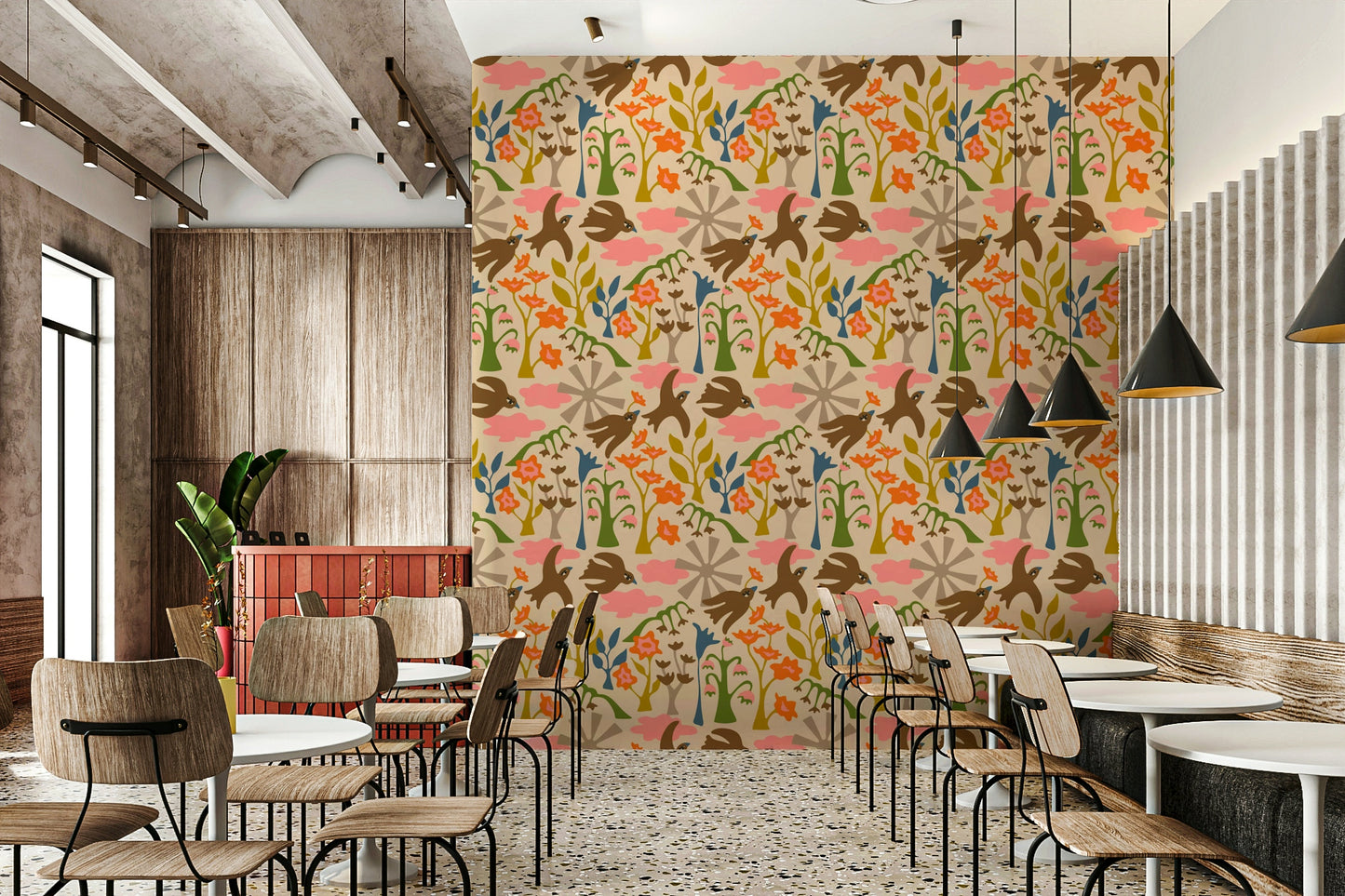 Earthy wallpaper with flying birds and bright florals
