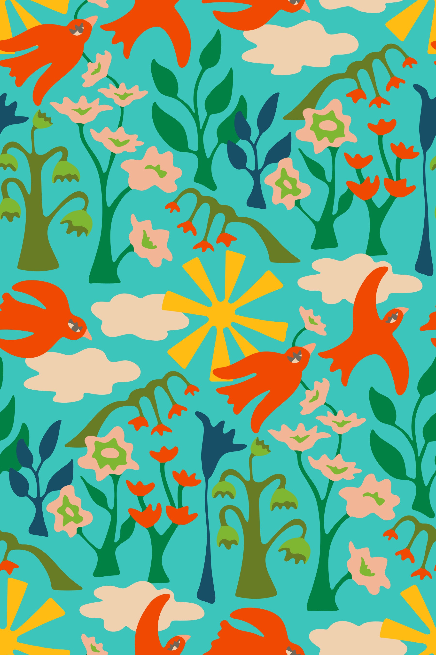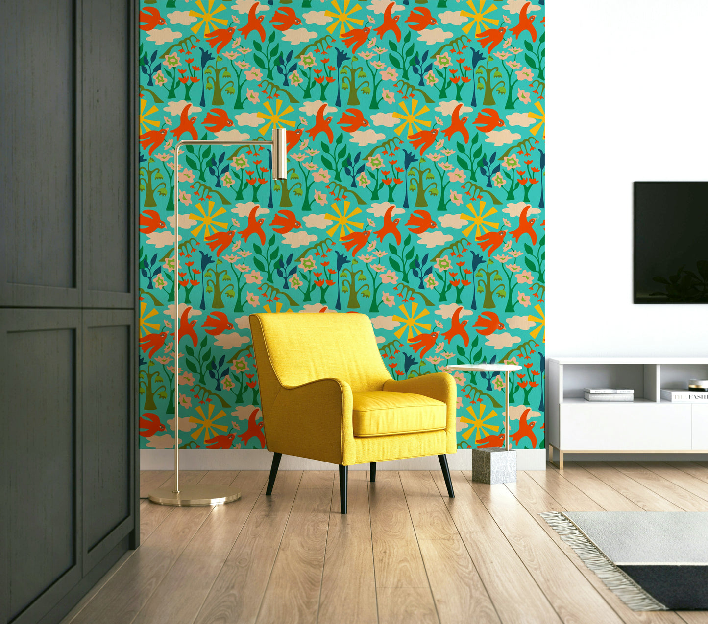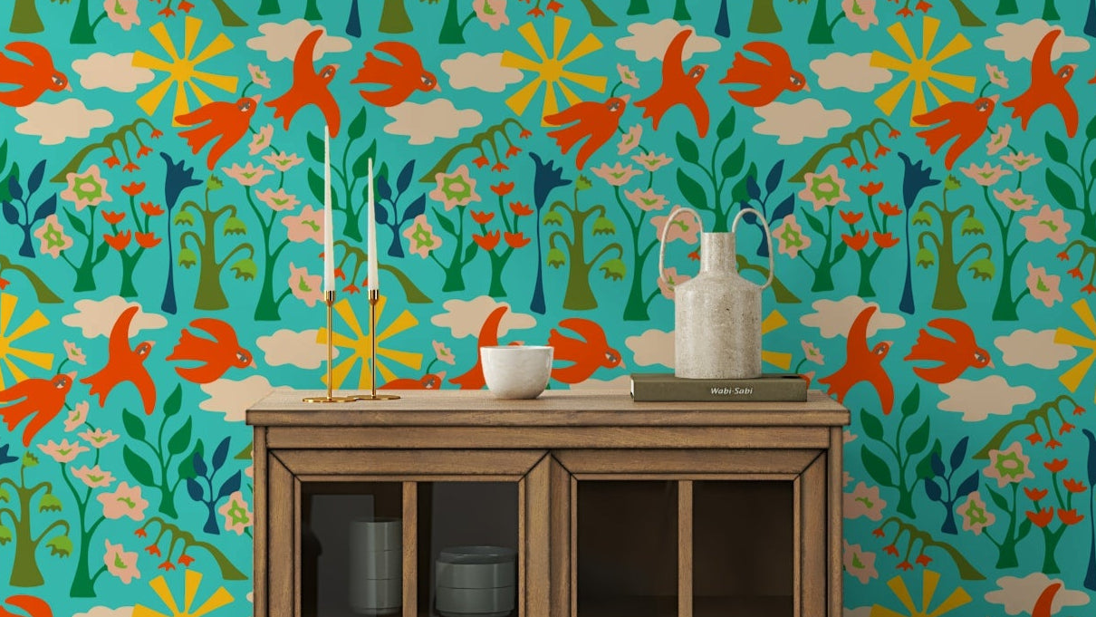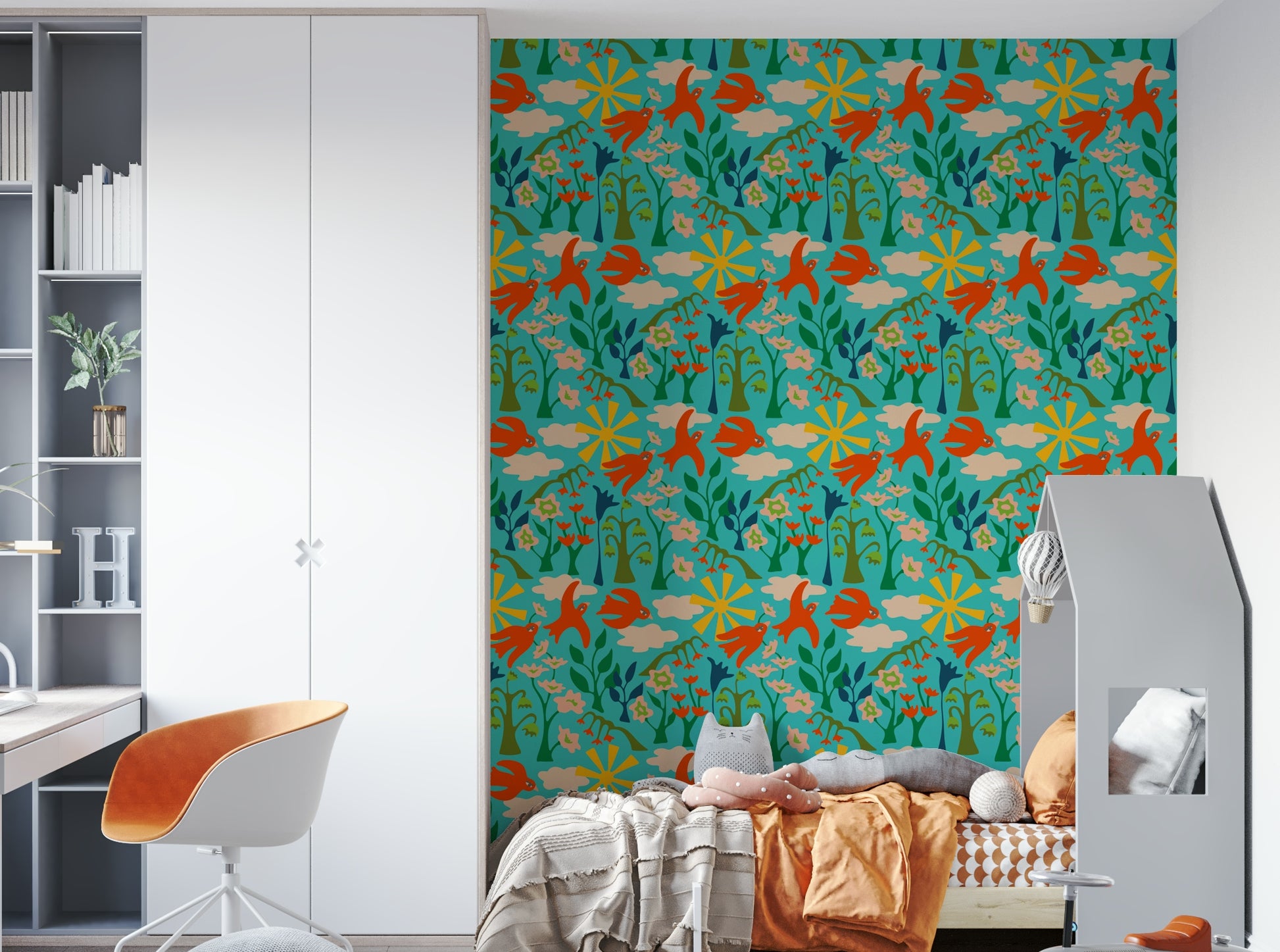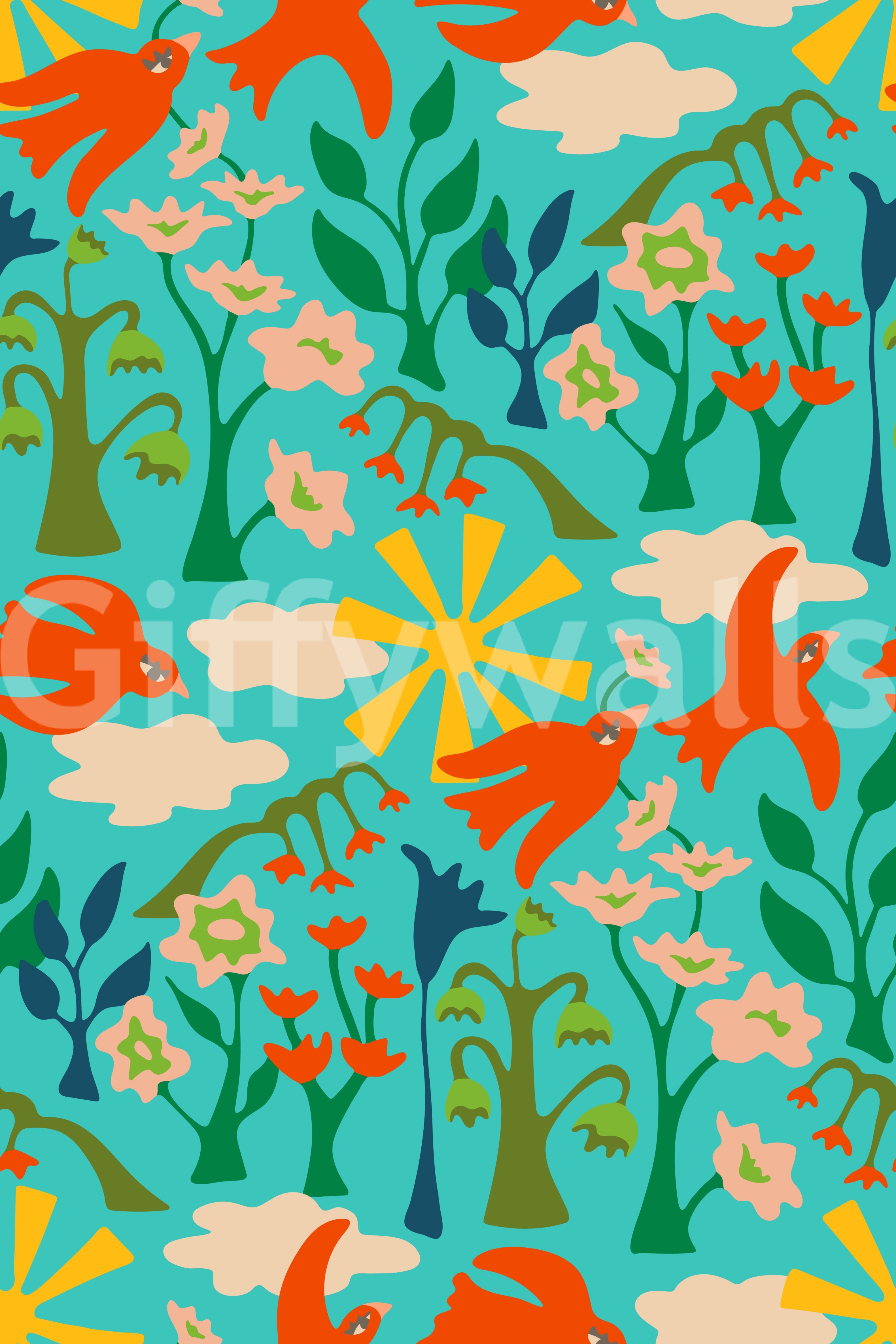 Embrace the joy of Summer with this charming floral garden wallpaper. Bright red birds flit amongst abstract flowers and plants in blue, olive, green, blush and sunny yellow, all set against a striking turquoise background. A shining yellow sun and creamy clouds add to the whimsy and cheerfulness. This design evokes a playful, vibrant mood, perfect for brightening up any space. The bold color palette and whimsical elements make it an ideal choice for those seeking a touch of delightful art and nature-inspired design. This pattern design is also available in Other Colourways too! Original wallpaper pattern design by Jackie Tahara of UnBlink Studio.