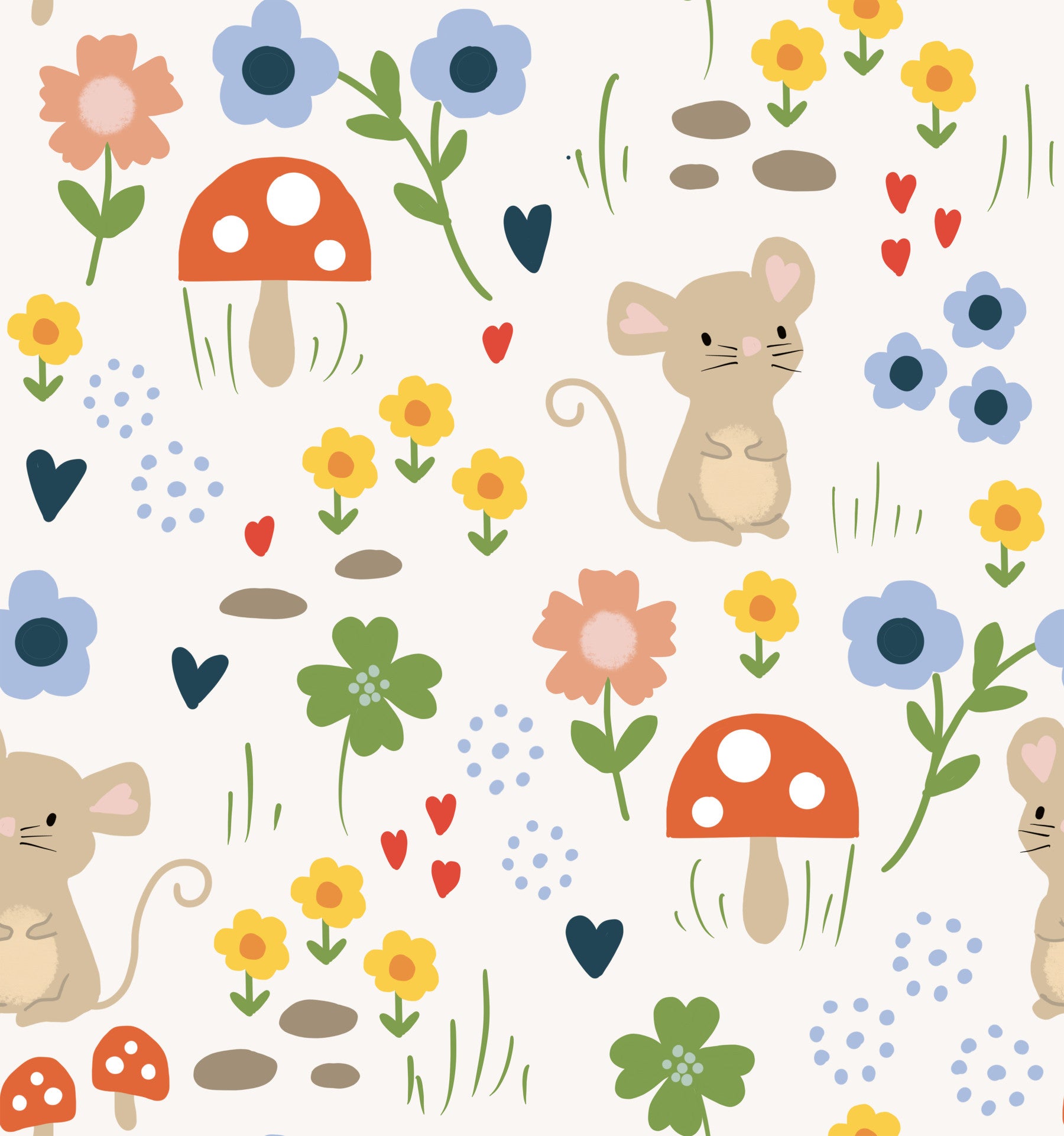 Delight in this charming 'Garden Mouse' wallpaper, a whimsical depiction of a friendly mouse amidst a vibrant floral landscape. Pastel flowers in shades of blue, yellow, and orange bloom alongside cheerful red toadstools and lush green clover. Scattered hearts and playful doodles add to the lighthearted and joyful atmosphere. The simple, stylized art perfectly captures a sense of springtime wonder, making this wallpaper ideal for creating a sweet and inviting space. Perfect for children's rooms, nurseries, or anyone who appreciates a touch of whimsical charm.